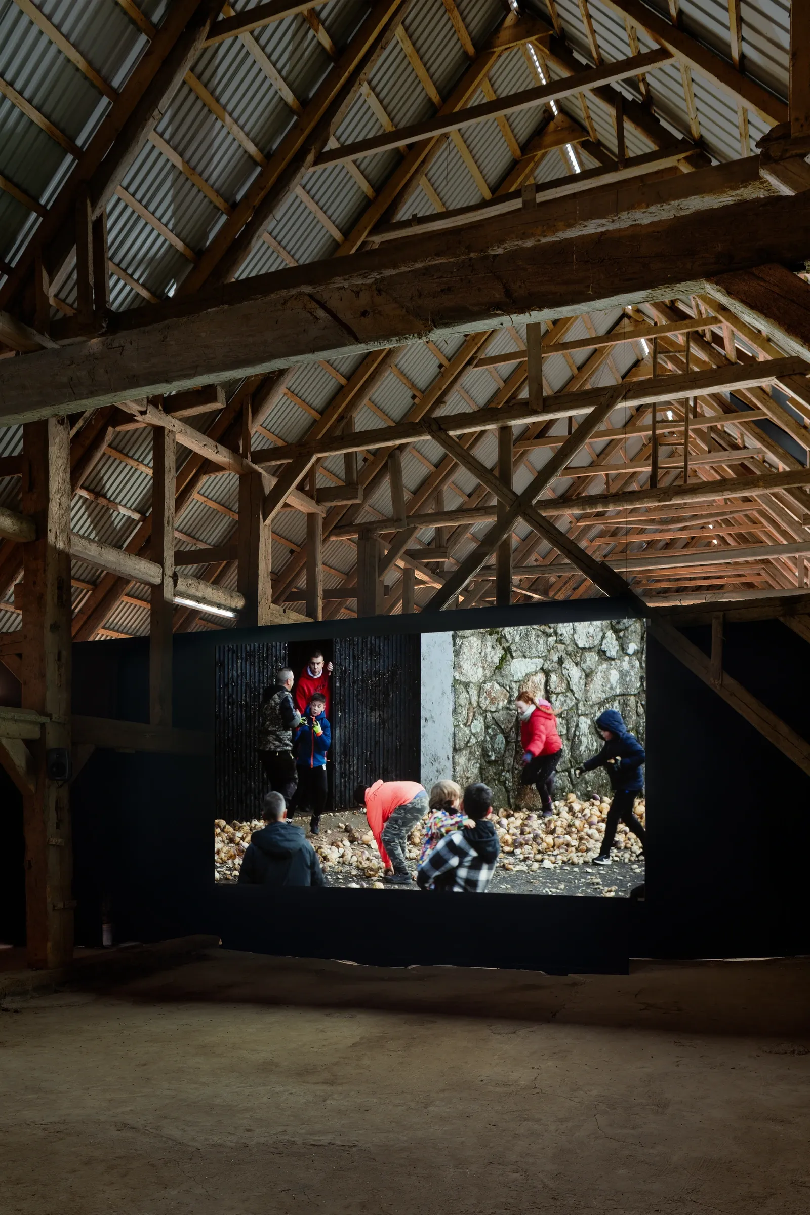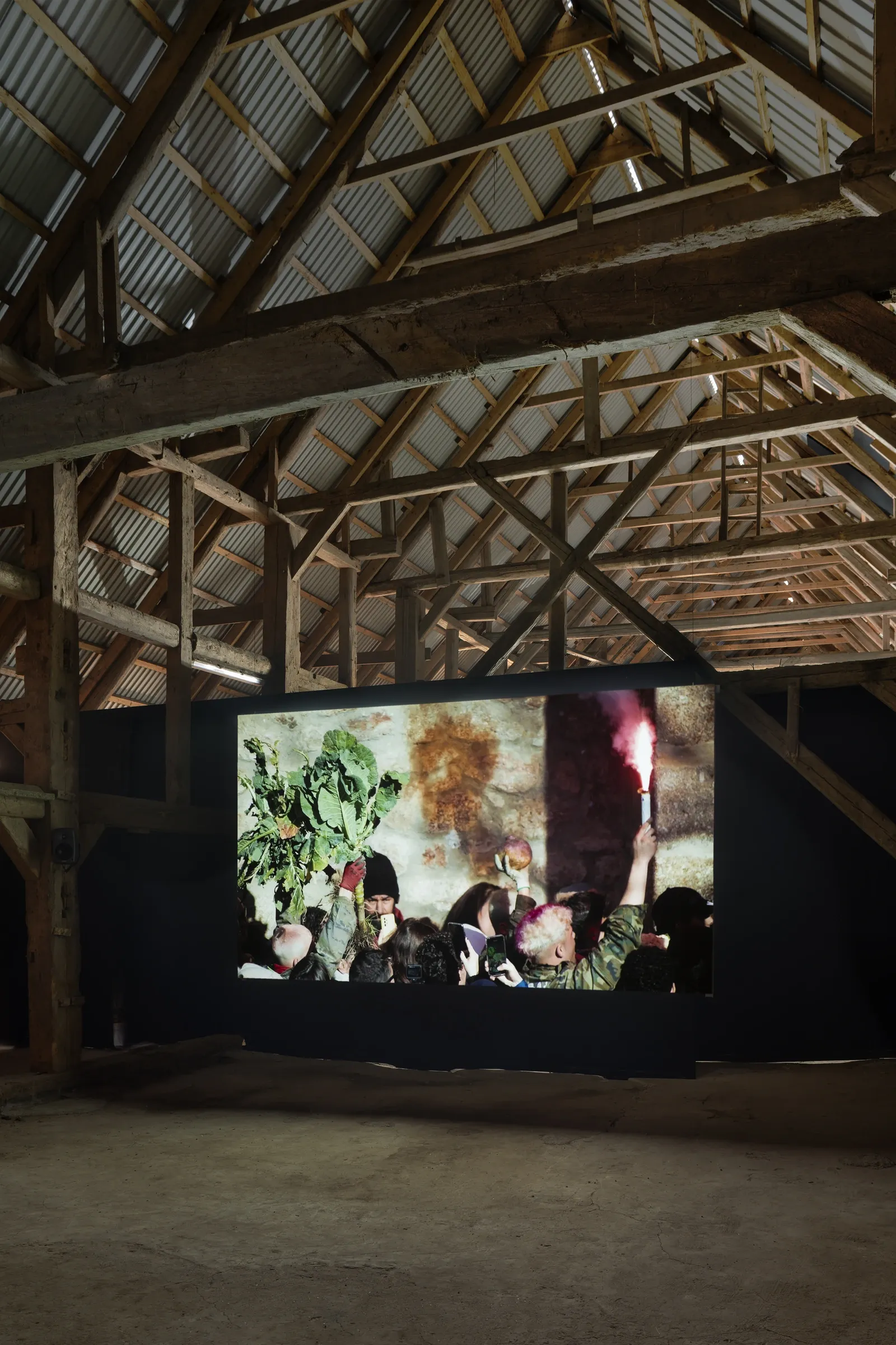 Surge opens at Kunsthal Thy inside a raw timber-framed barn, the exposed beams, earthen floor, and corrugated roof constituting a space that mirrors the material logic of both films without ever announcing the connection.