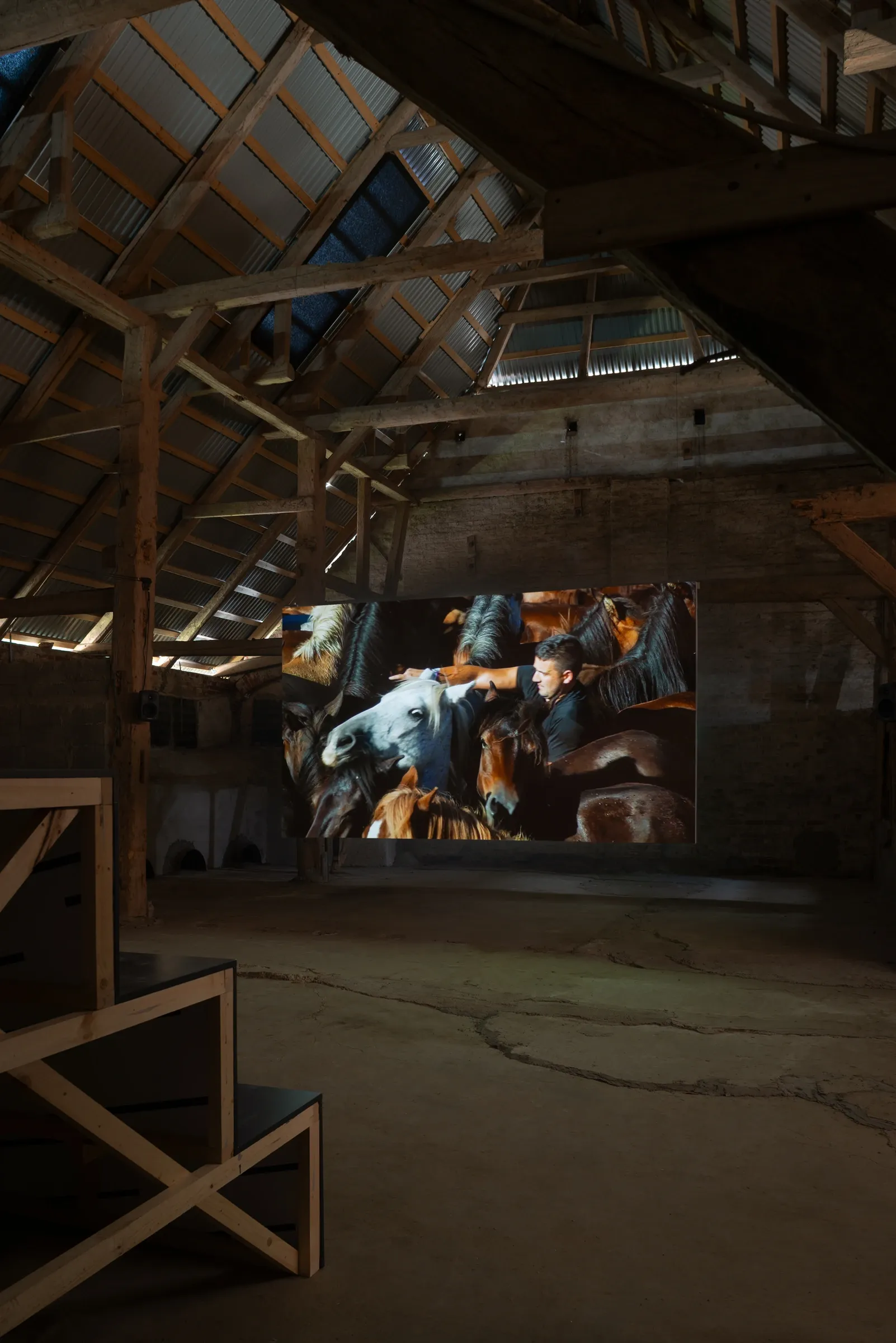 The venue is itself one of Denmark's oldest farms, Dovergaard, in South Thy. Thy's agricultural history runs beneath this exhibition without needing to be explained. The region's farming population worked with horses as indispensable animals; turnips were reliable food in years of uncertain harvests. Placing Afsah's videos here means the viewer brings context that pre-exists any curatorial framing. The barn does not illustrate the work. It activates it differently than a white cube could.