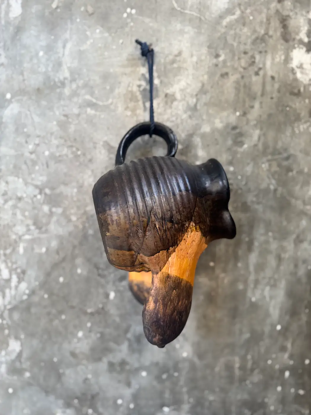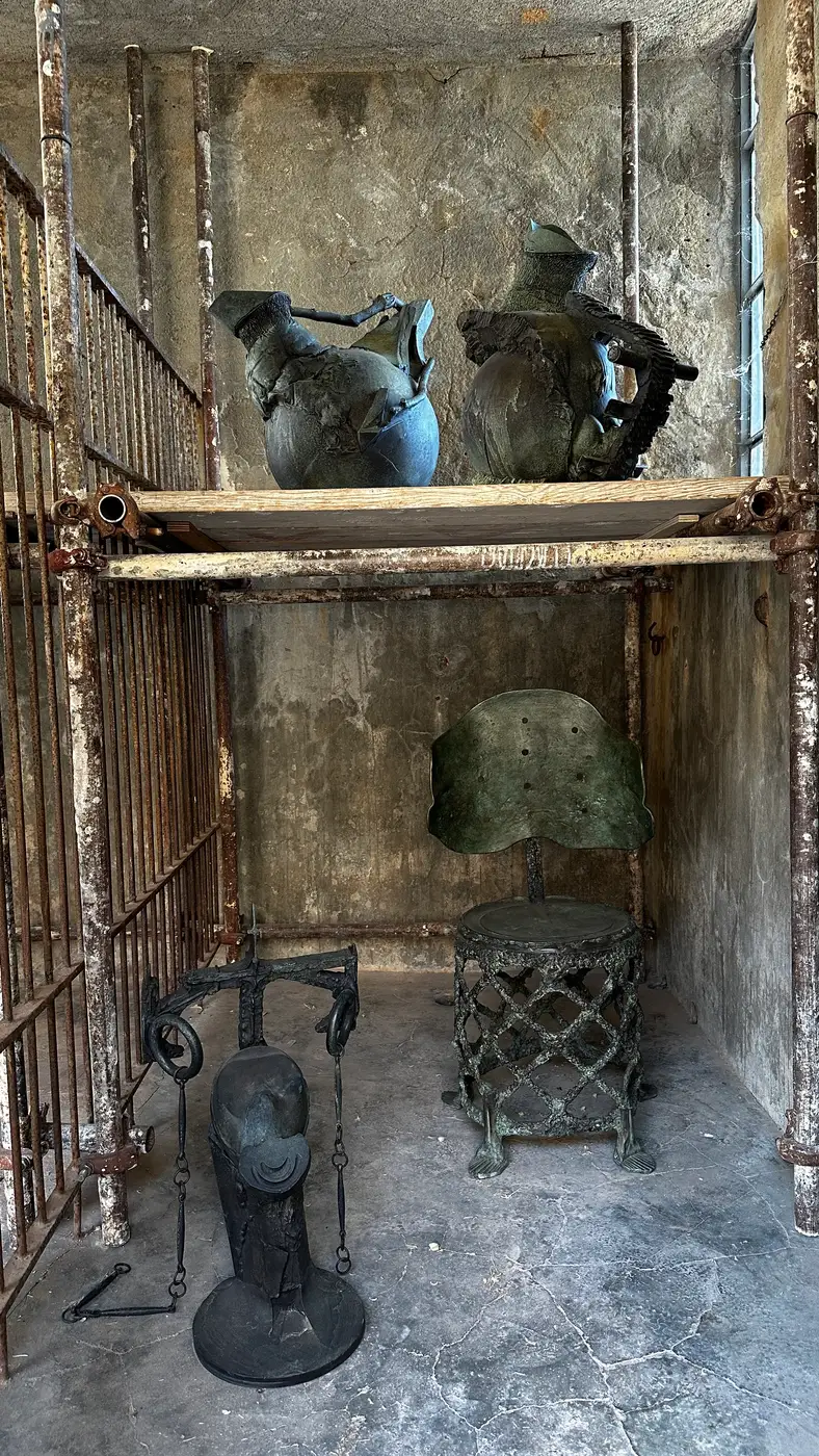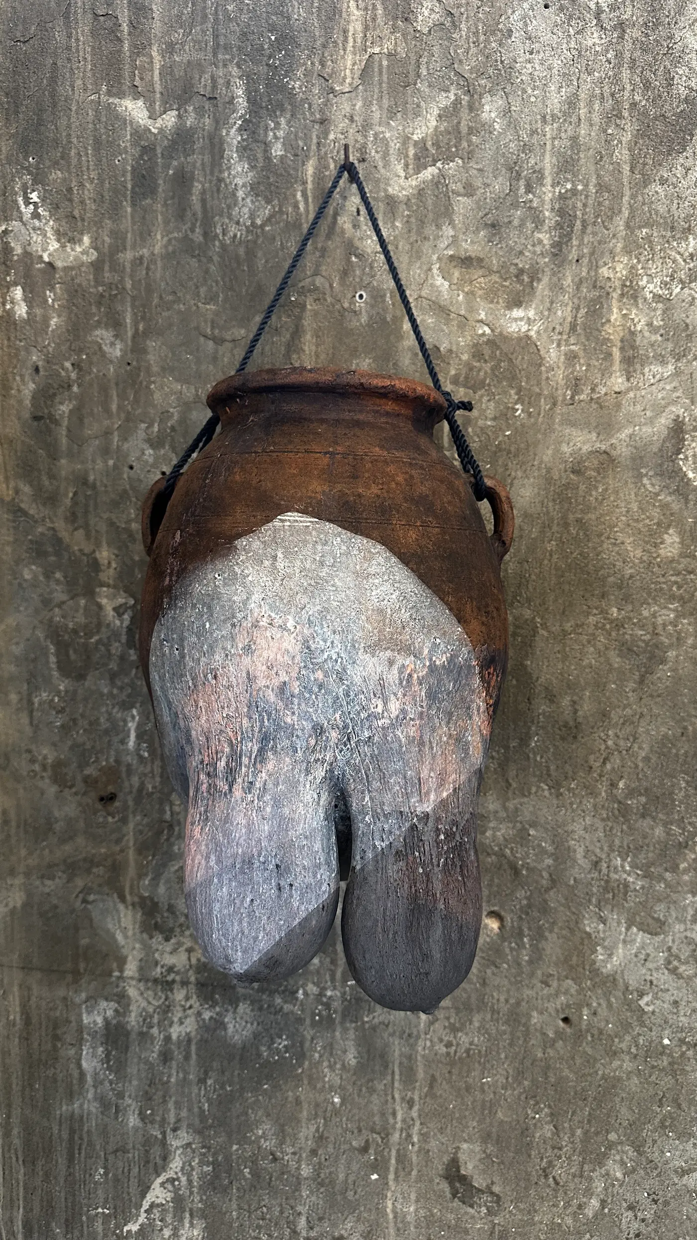 Against the rough stone walls, smaller works hang like relics scavenged from a shipwreck, weathered pots fused with organic forms, their surfaces rich with false erosion.