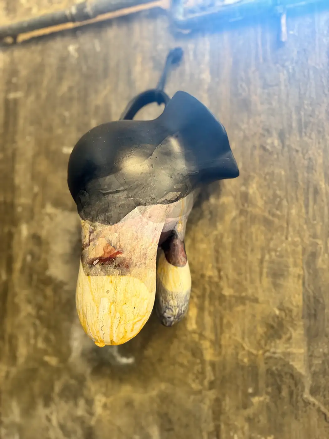 Andra Ursuța, Apocalypse Now and Then, wall-hung vessels from the “Desolation Ware” series at DESTE Foundation Project Space (Slaughterhouse), Hydra, 2025. Faux-historicist jugs with breast/udder motifs, lost-wax cast in bronze with ceramic-like patina, turn archaeology into a dark, bodily reliquary. Image courtesy of Munchies Art Club.
