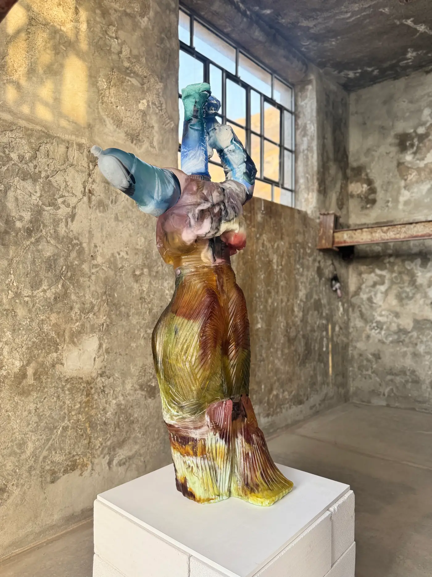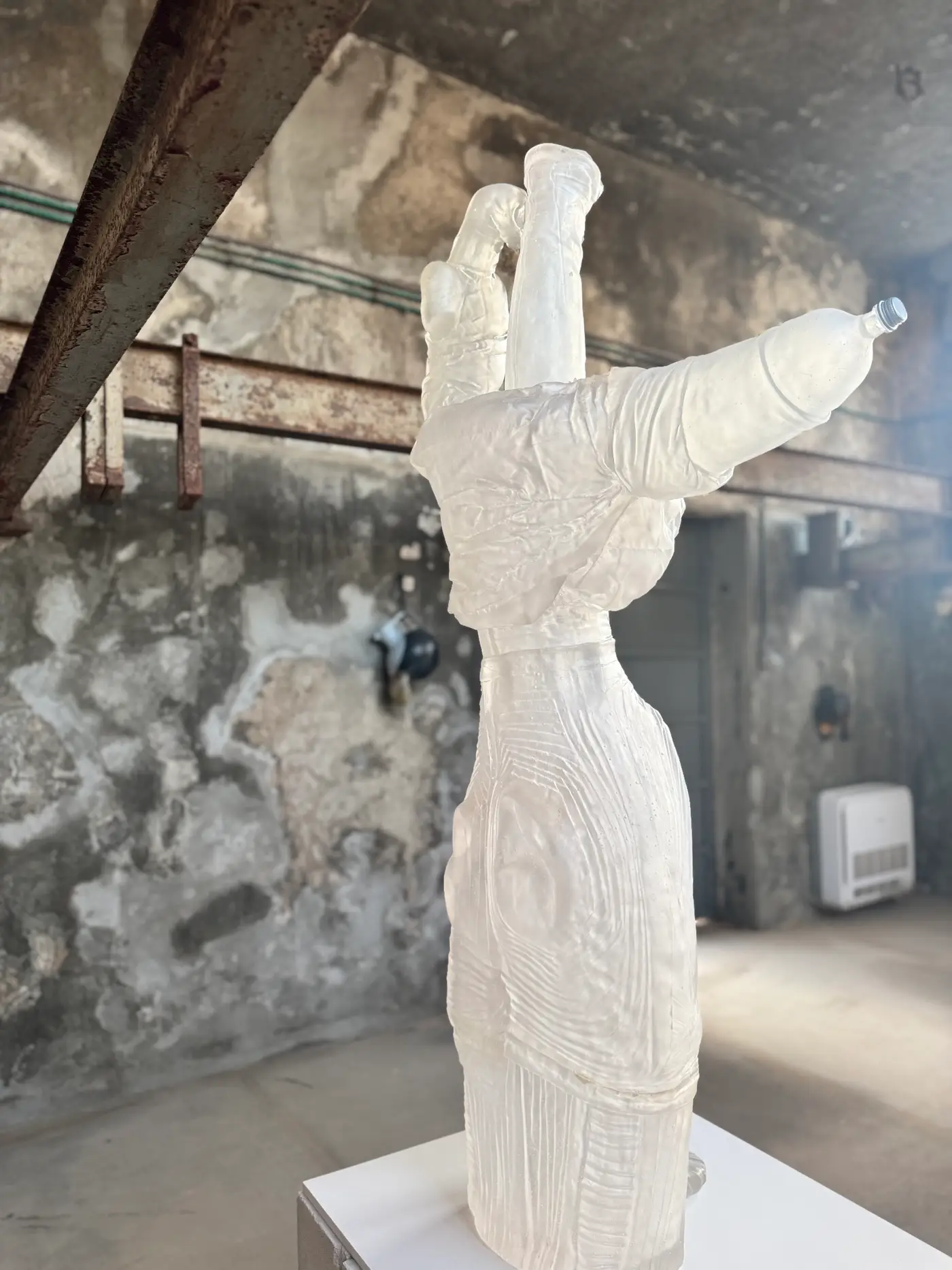 In translucent resin, fragmented female torsos stand on stark white plinths, their arms raised in a frozen gesture that is both triumphant and defensive.