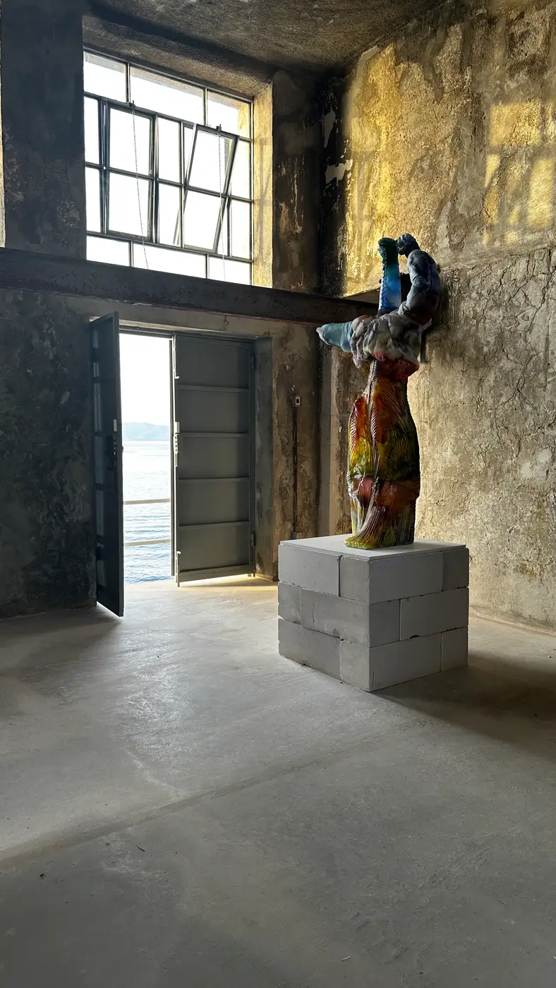 DESTE Foundation Project Space (Slaughterhouse), Hydra—installation view of Andra Ursuța’s “Apocalypse Now and Then,” 2025: translucent glass torso and colorful mixed-media figure on block plinths, rough concrete walls, sea visible through open doorway.