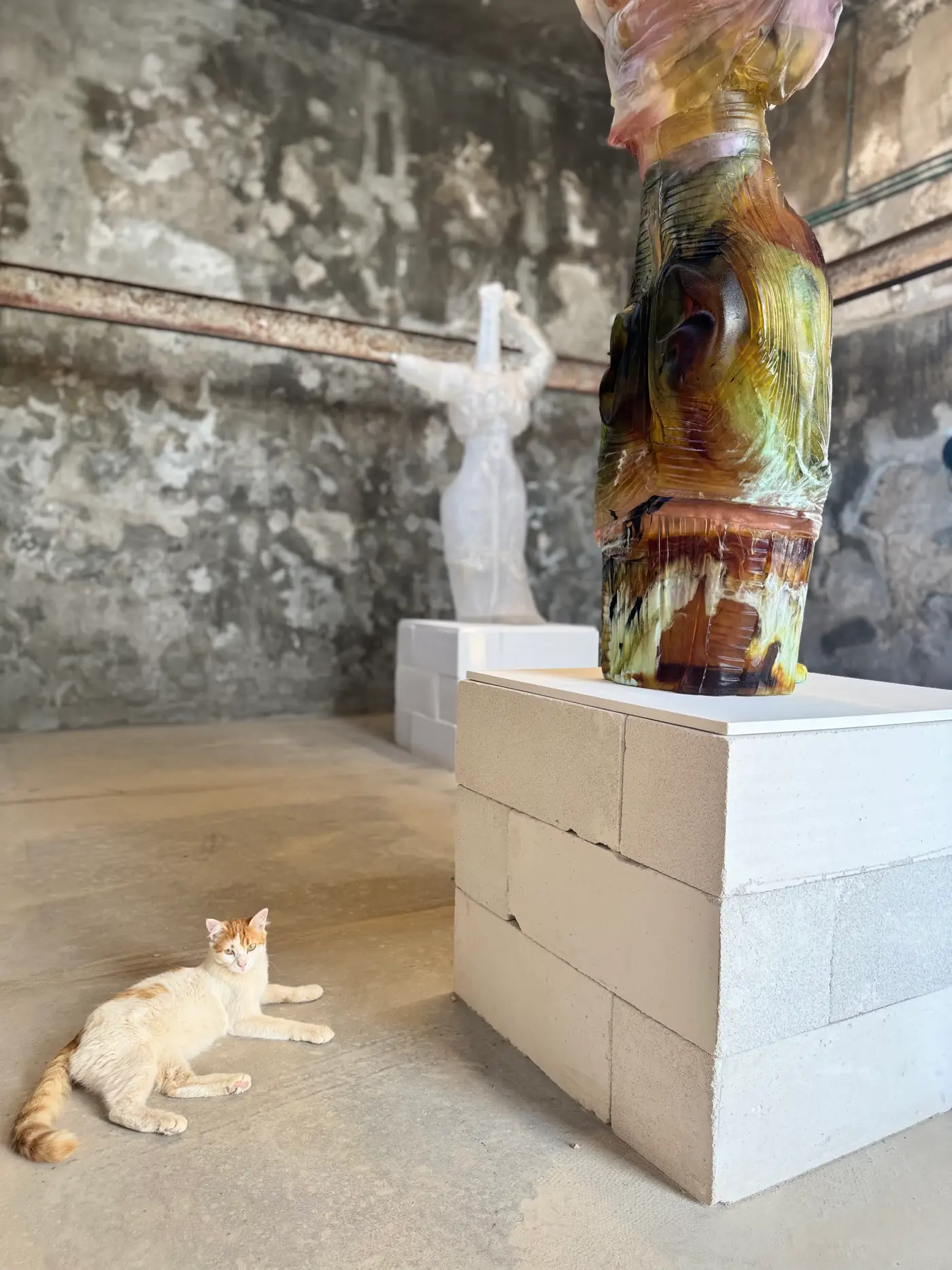 Andra UrsuțaApocalypse Now and Then — installation view at DESTE Foundation Project Space (The Slaughterhouse), Hydra, Greece, 2025. Translucent cast-glass and polychrome, mixed-media bodies on concrete-block plinths sharpen the show’s tension between beauty, brutality, and myth. Image courtesy of Munchies Art Club.