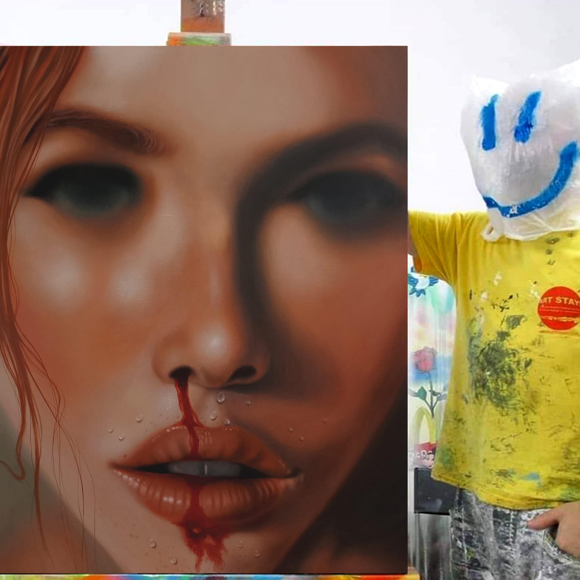 Angelo Volpe in his studio, standing next to one of his paintings on canvas, entitled “The Intoxicating Sensation Of A Shooting Star, 2024” | Courtesy of the artist / Angelo Volpe. Vanity (2024), 80 x 60 cm. Courtesy of the artist