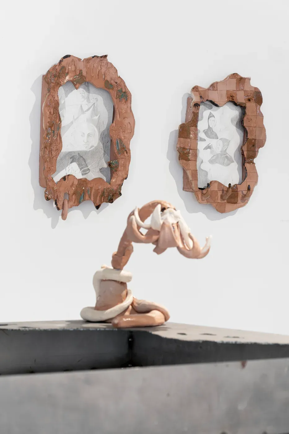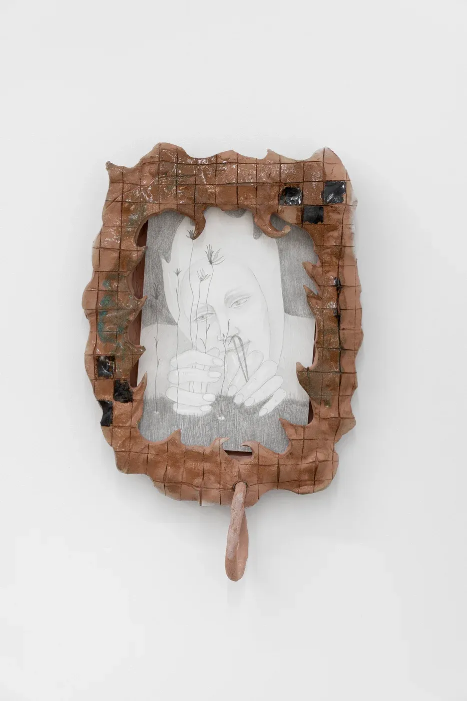 Anna Bochkova's artworks, encased in uniquely sculpted clay frames, feature delicate graphite drawings that explore the intricate connections between human and nature. The drawings are rendered with a soft touch, depicting figures engaging tenderly with plants, a motif that emphasizes the symbiotic relationship between humanity and the environment. These vignettes are framed by the rough, organic contours of the clay, which contrast with the finesse of the graphite, highlighting the fragile balance between nature and human intervention. | Adam Šakovy / Tomas Umrian Contemporary