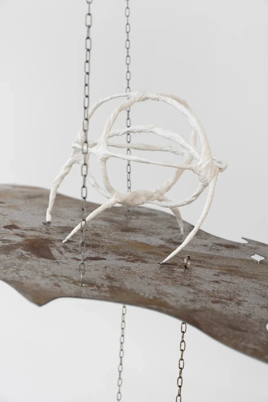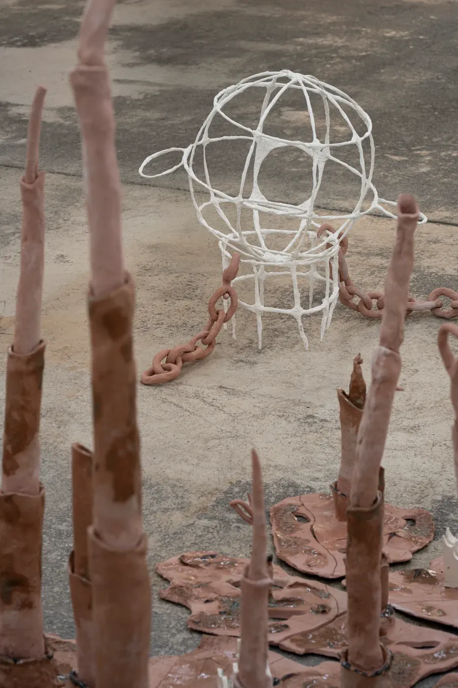Munchies Art Club Magazine is proud to feature "Reaching the Earth," an evocative exhibition by Anna Bochkova, currently on display at Tomas Umrian Contemporary in Bratislava. Bochkova's work brilliantly explores the interplay between organic forms and conceptual artistry, making this exhibition a must-see for those visiting or residing in Bratislava. The blend of earthy clay sculptures with ethereal suspended elements creates a visually stunning narrative that captivates and engages audiences, reflecting the depth and complexity of human and environmental interactions. | Adam Šakovy / Tomas Umrian Contemporary