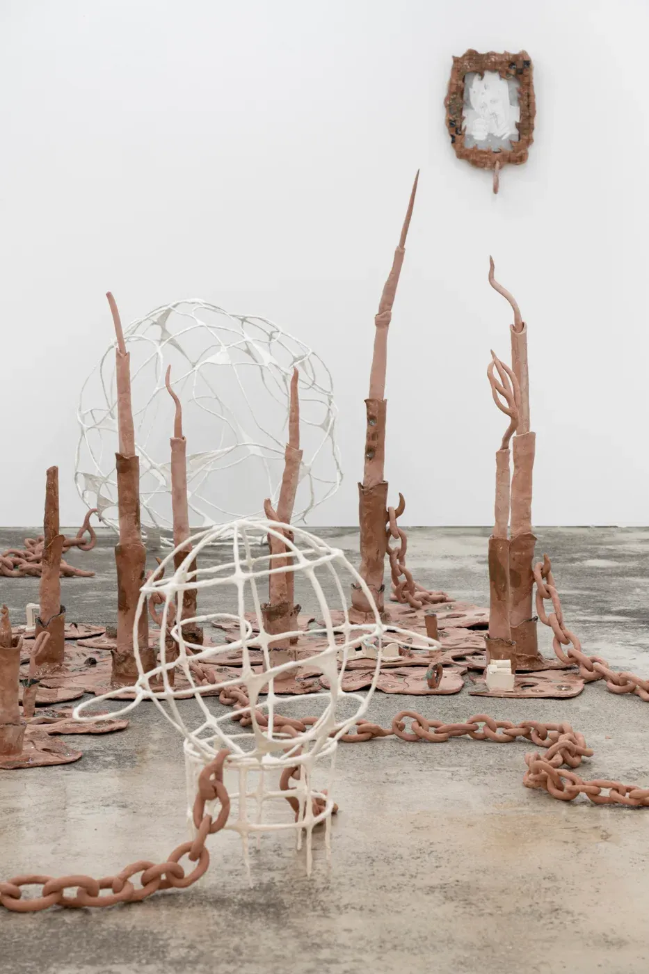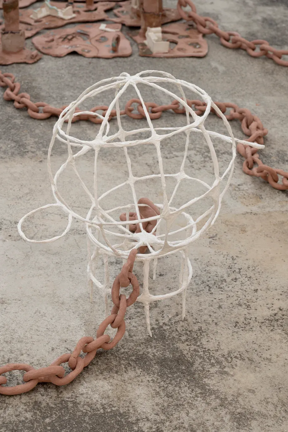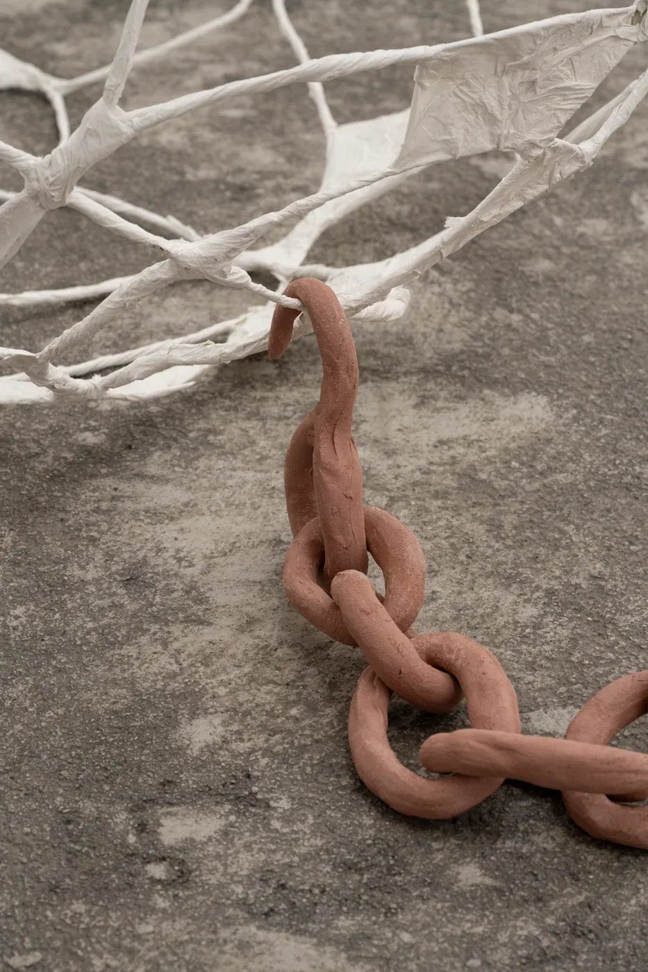 This choice of medium is significant as clay is one of the most primal and traditional materials used in art, representing the rawness of nature and human interaction with the earth. The chains and white globes interspersed among these clay formations introduce a contrast—between the grounding of the clay and the seeming attempt of the globes to rise above it, suggesting a dynamic tension between being rooted in reality and striving towards the ethereal or ideal. Bochkova's work challenges viewers to consider the ways in which they are connected to the natural world and the various forces that shape their perceptions of space and identity within it | Adam Šakovy / Tomas Umrian Contemporary