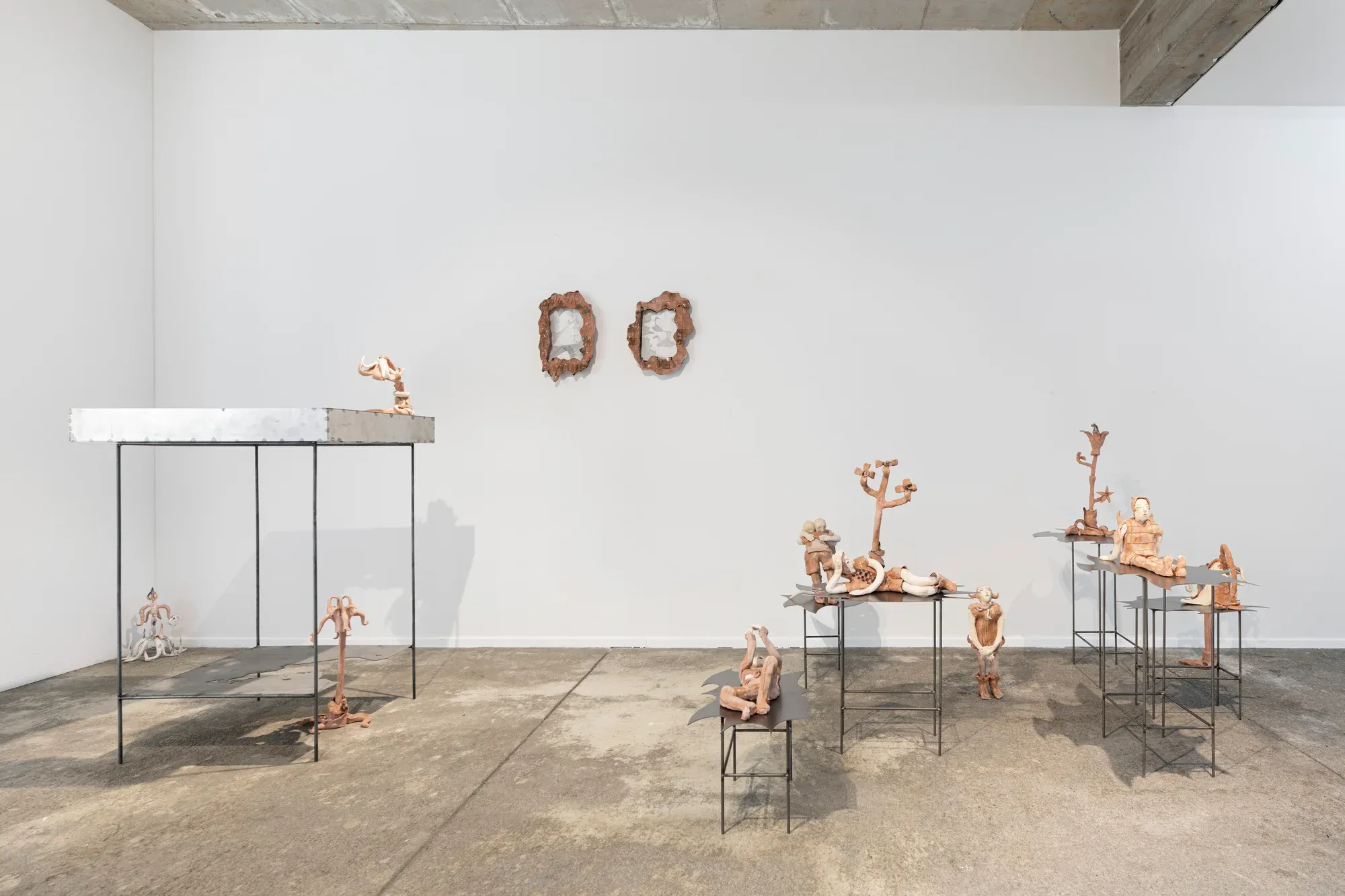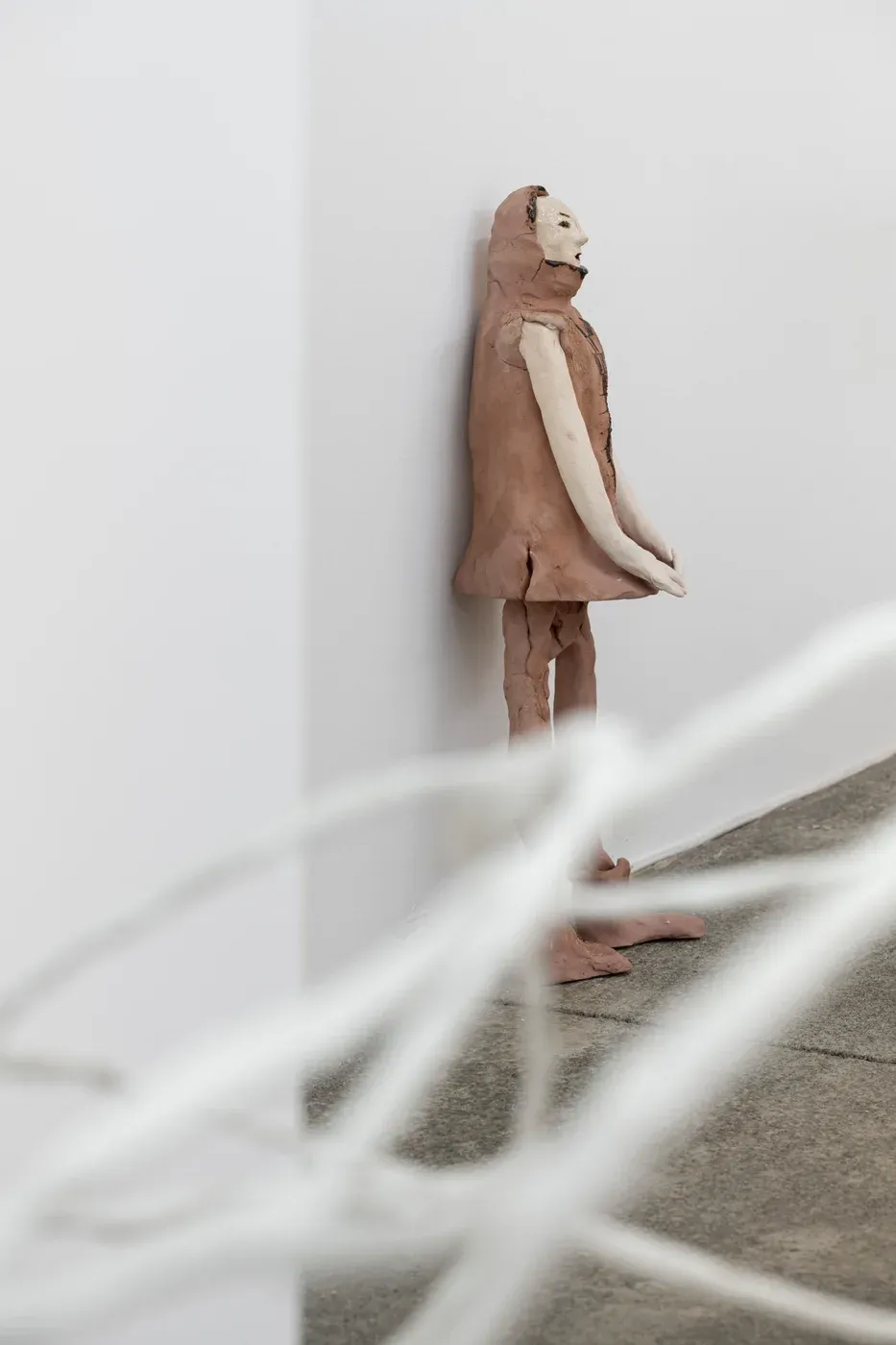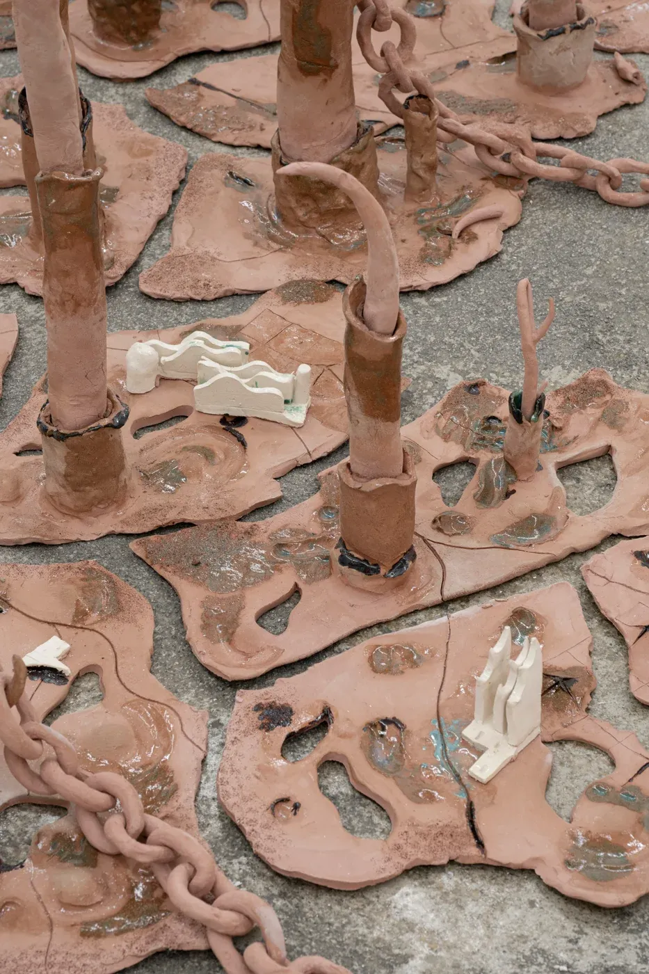 The installation consists of different zones that create a space, where we can think about non- hierarchical interactions between human beings and non-human others: as for example in the group ‘vulnerable dawn’ of ceramic human figures, which communicate with flowers and organic elements.