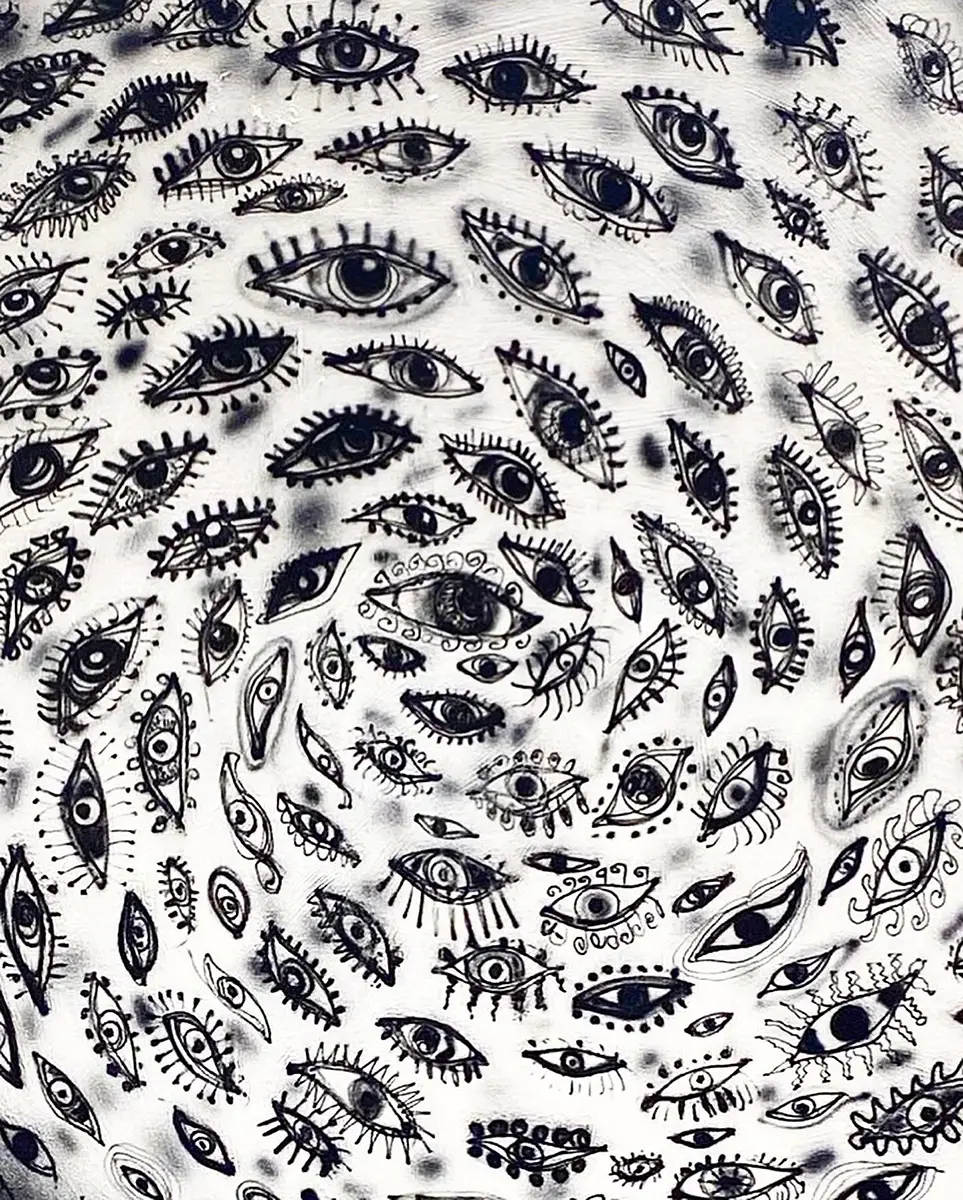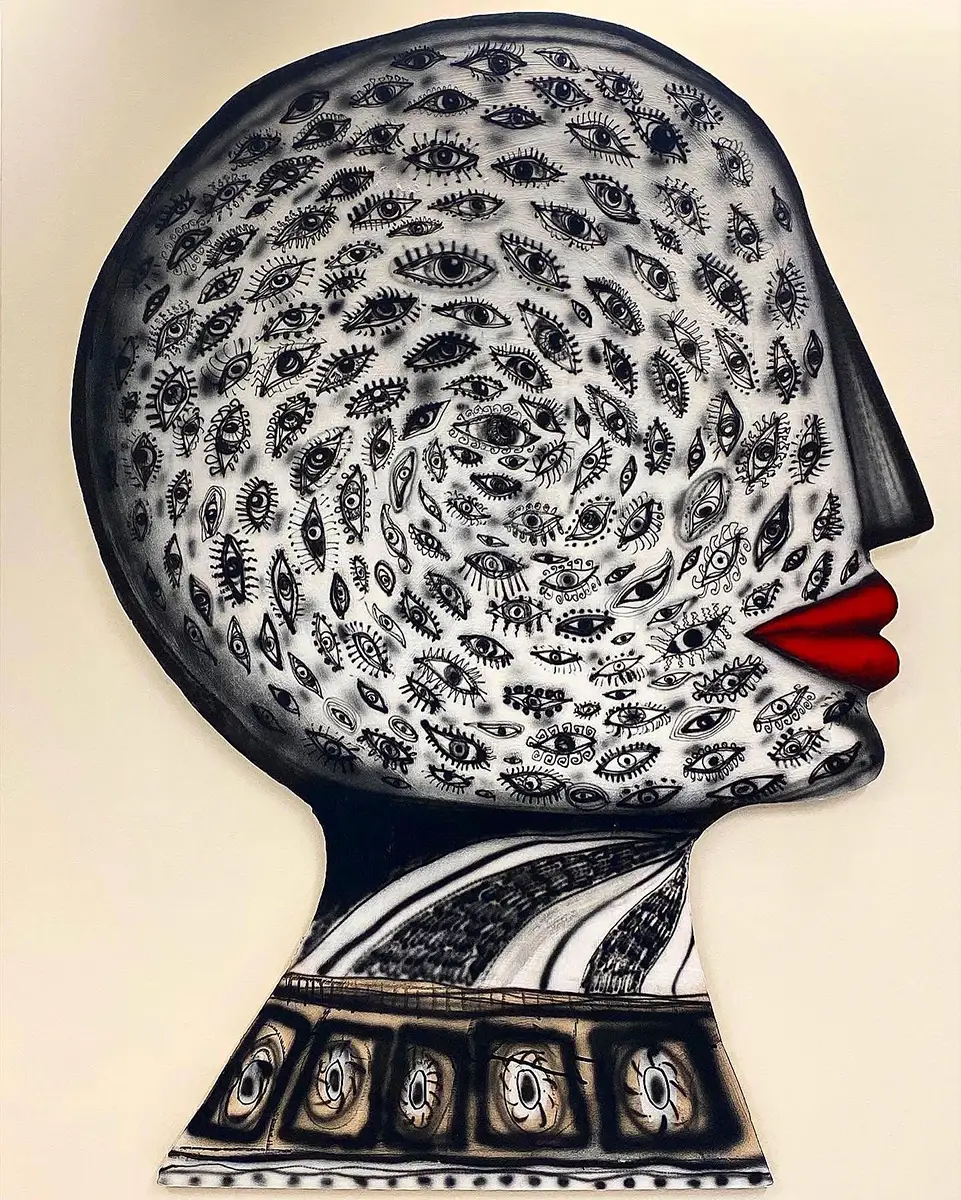 Through mediums like painting, collage, and airbrush, he constructs anachronistic visions that weave a symbolic tapestry from our collective unconscious.