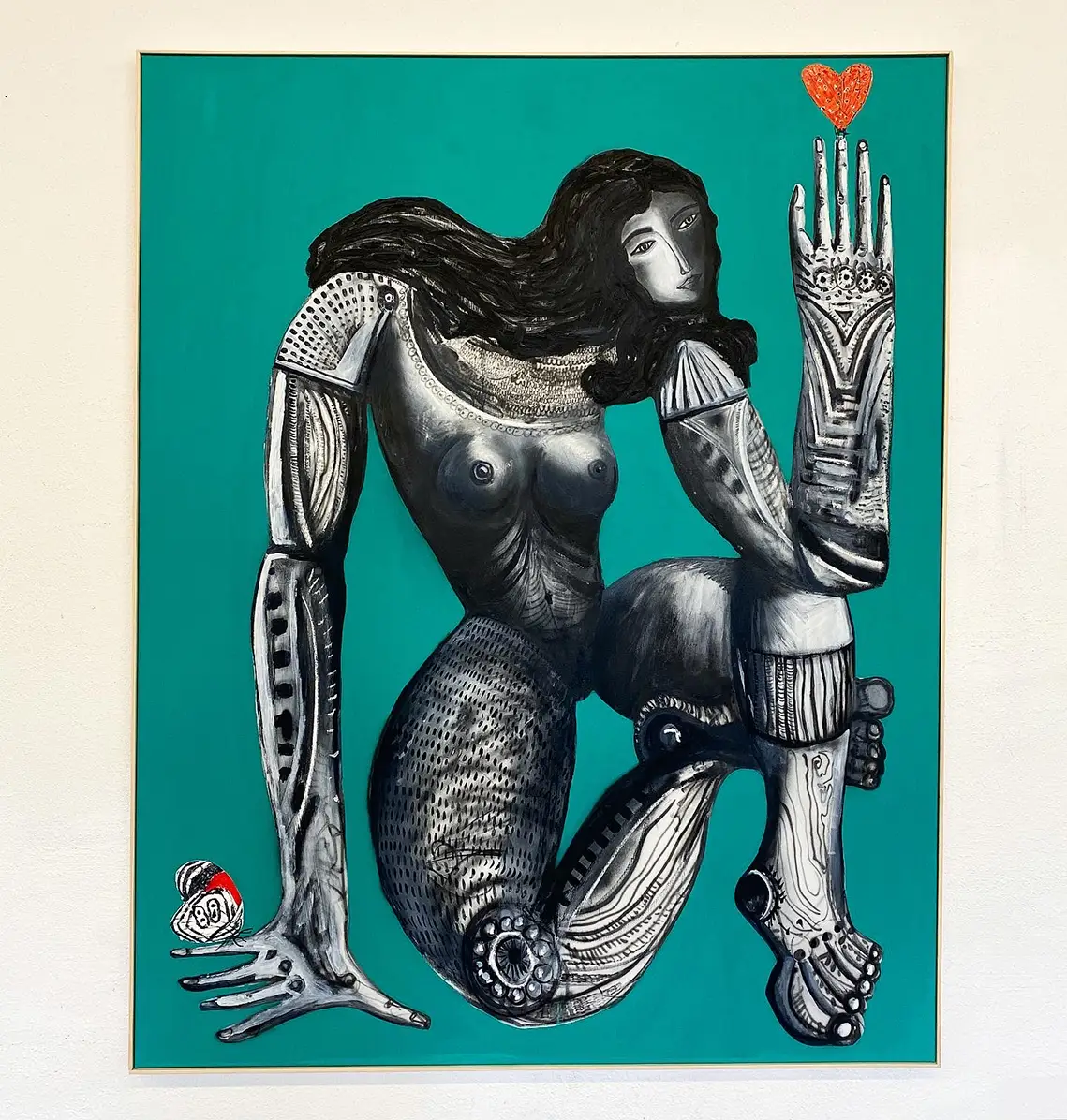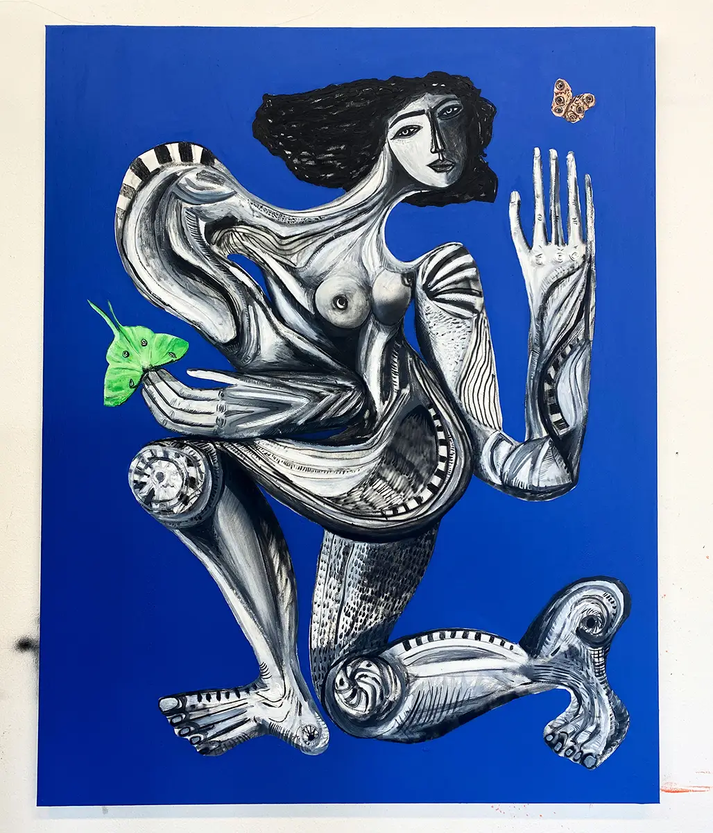 Creatures, goddesses, and monsters emerge as part of a personal folklore, blurring temporal lines and reshaping ancestral themes into contemporary forms that challenge our perception of the present.