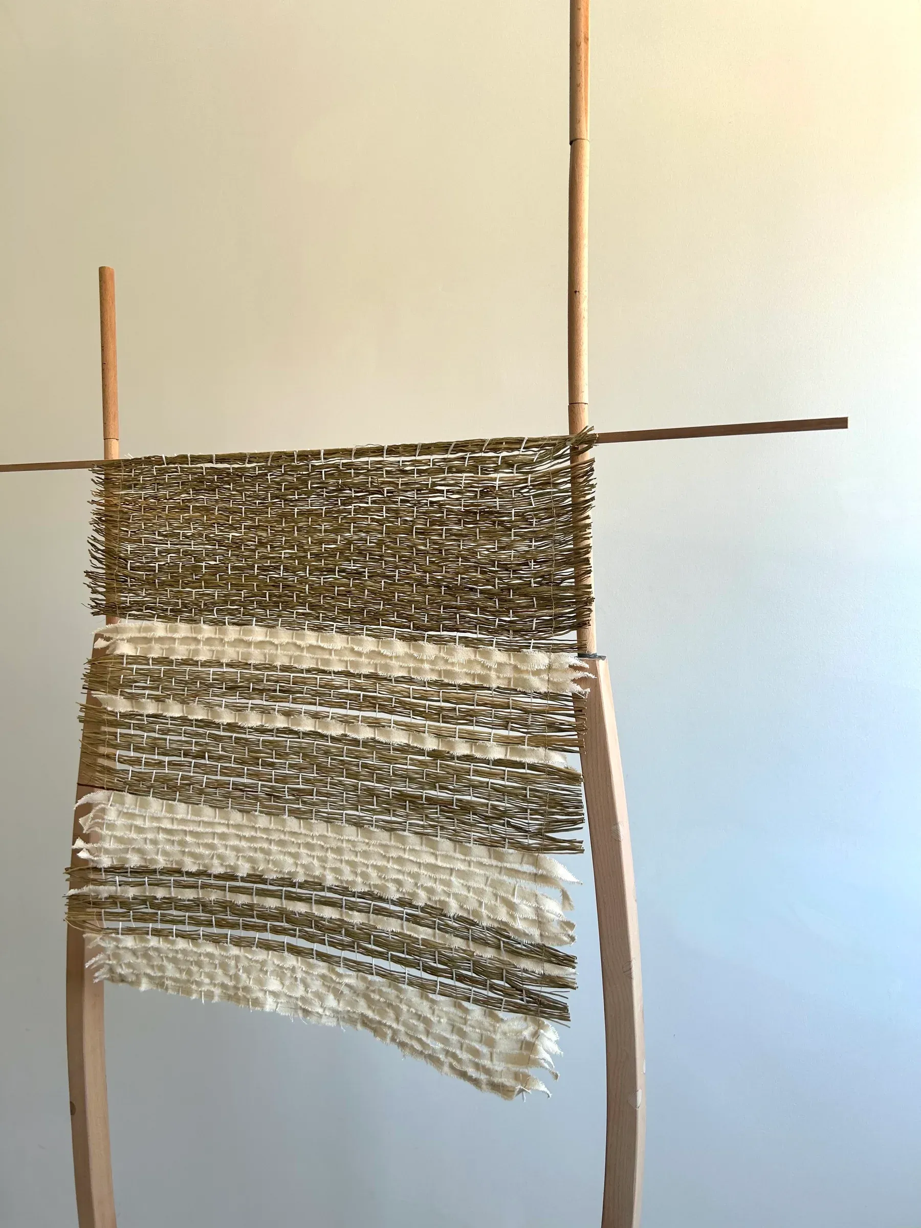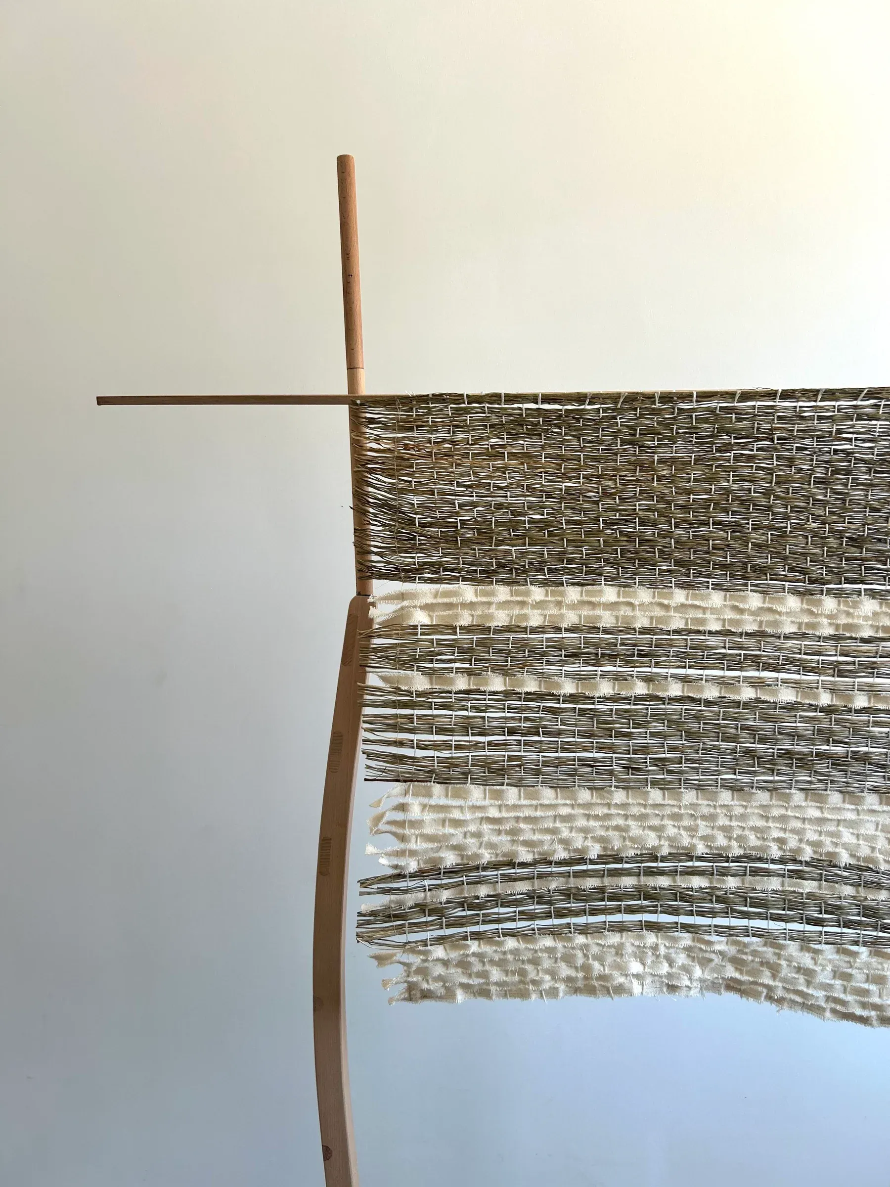 The woven sections shift between open and closed, letting air move through them in uneven intervals. The structure appears both held and holding itself, as if testing its own balance.