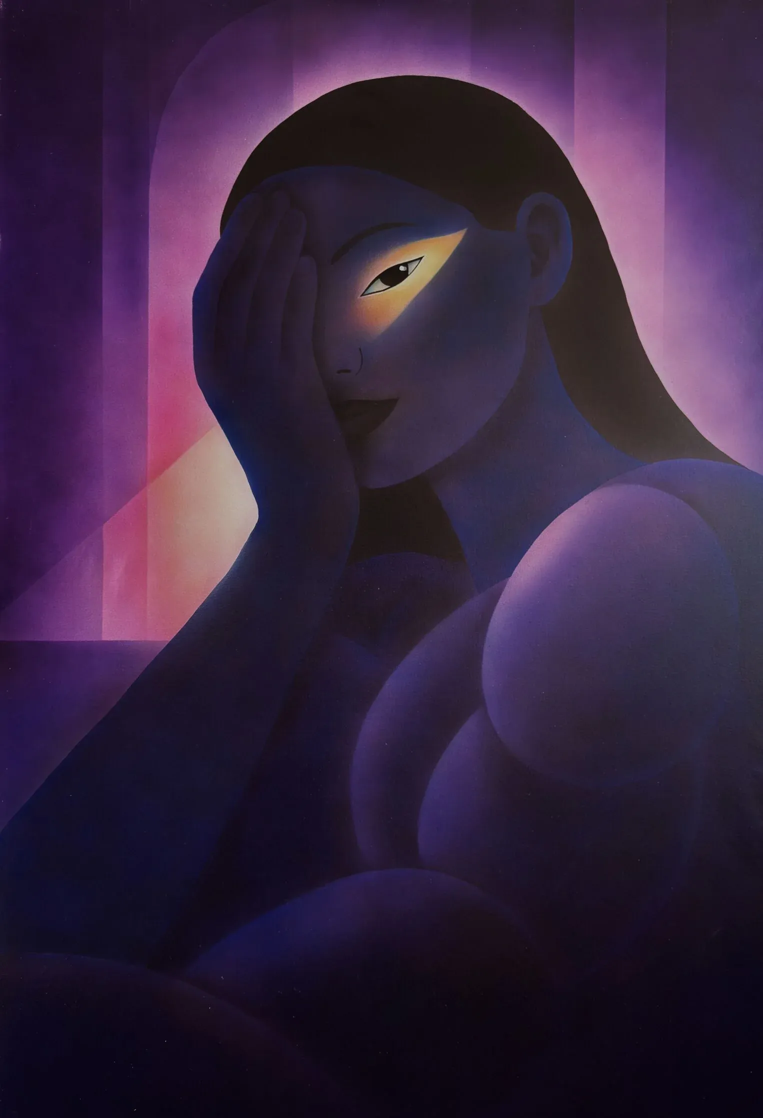 The figures in Aziya's paintings are composed. Composed to the point of removing something — the hand, the brushstroke, the evidence of making. Painted exclusively with airbrush on linen, her canvases hold the quality of an image that has arrived fully formed: smooth, interior, and faintly resistant to resolution.
