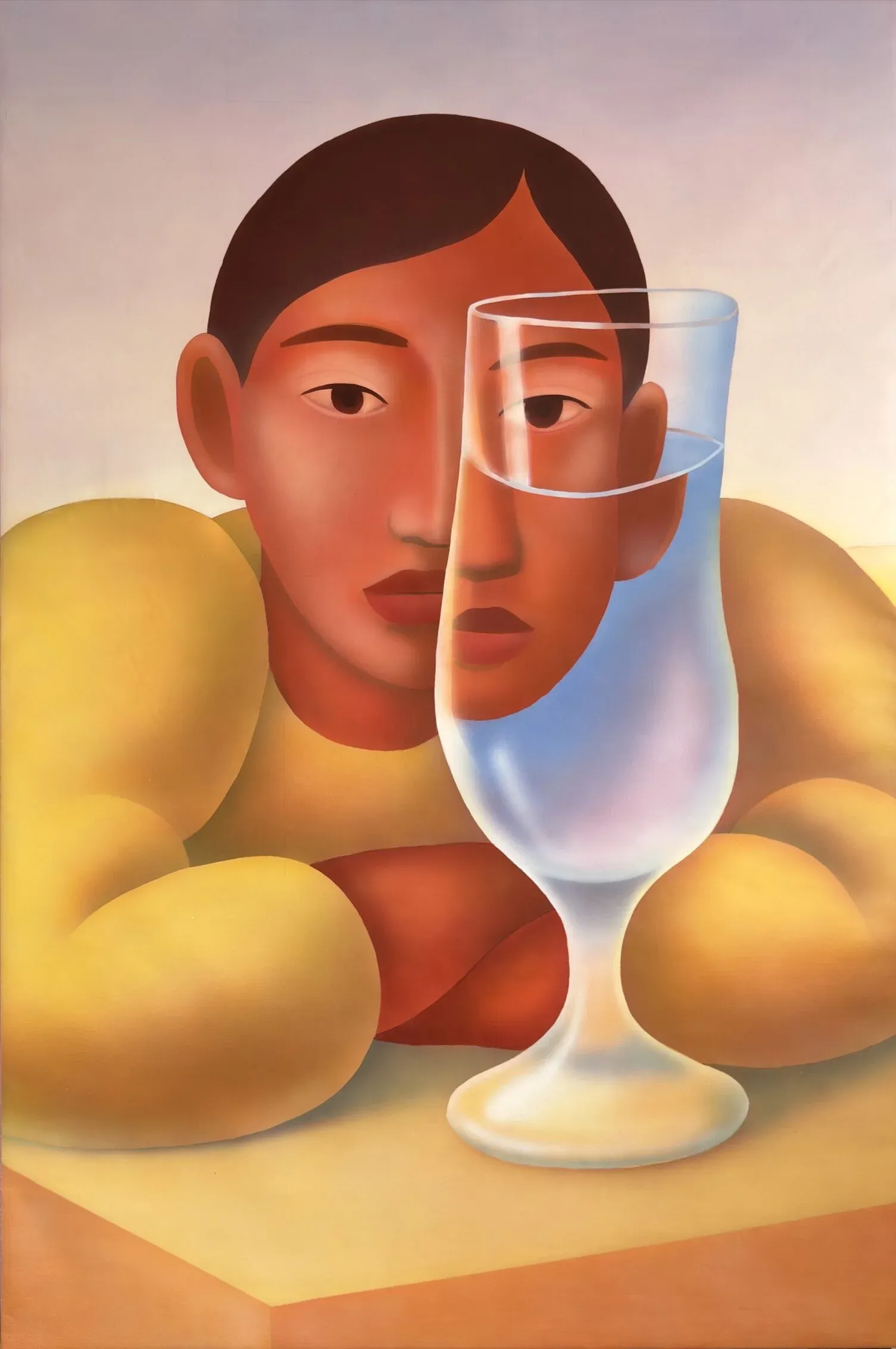 The airbrush holds these tensions in place formally. Without visible gesture, without the trace of the hand that made the image, Aziya's paintings achieve a controlled remove. The surface seems to give nothing away. This is the technical equivalent of her conceptual argument: the outside cannot confirm what the inside holds. What persists across the works is the sense that the figures know more than they show — and that the paintings know more than the figures do.