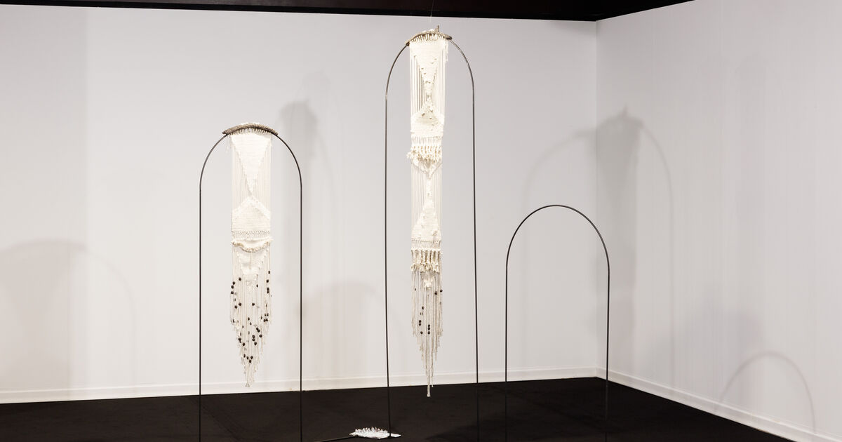 Jokhova's installations blend materials like stone, textiles, and ceramics, often referencing ancient rituals and contemporary landscapes.