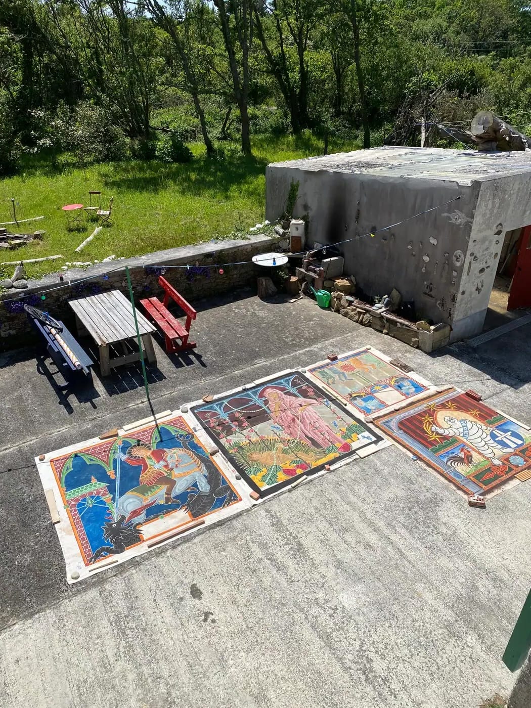 Einsmann’s imagery draws strongly from Romanesque frescoes, medieval manuscripts, and early book printing, especially their refusal of illusionistic depth.