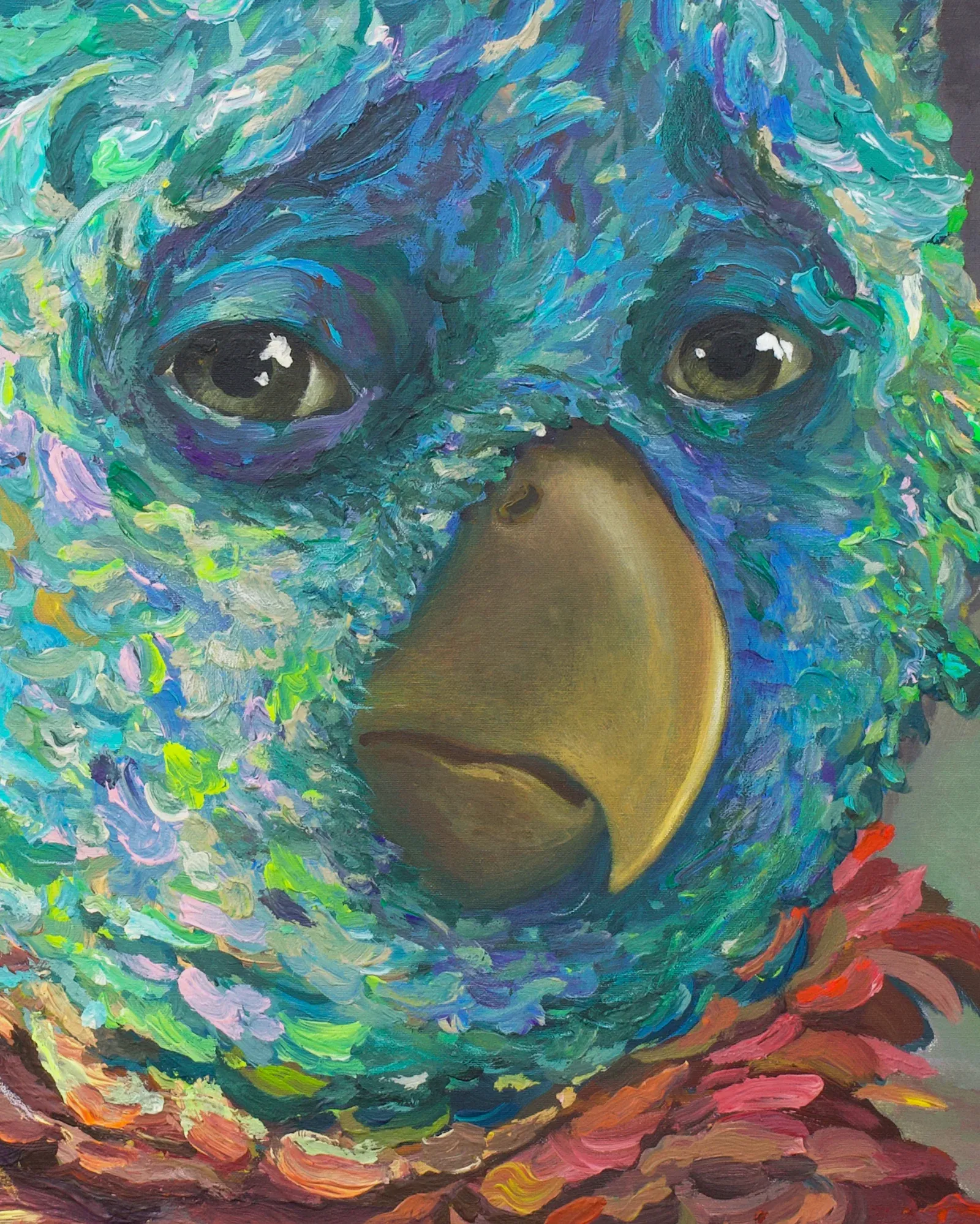The parrot paintings draw on the language of portraiture, yet refuse its social contract. Instead of offering access, they obstruct it. The viewer becomes aware of their own gaze, of the desire to read, categorize, and consume the image.