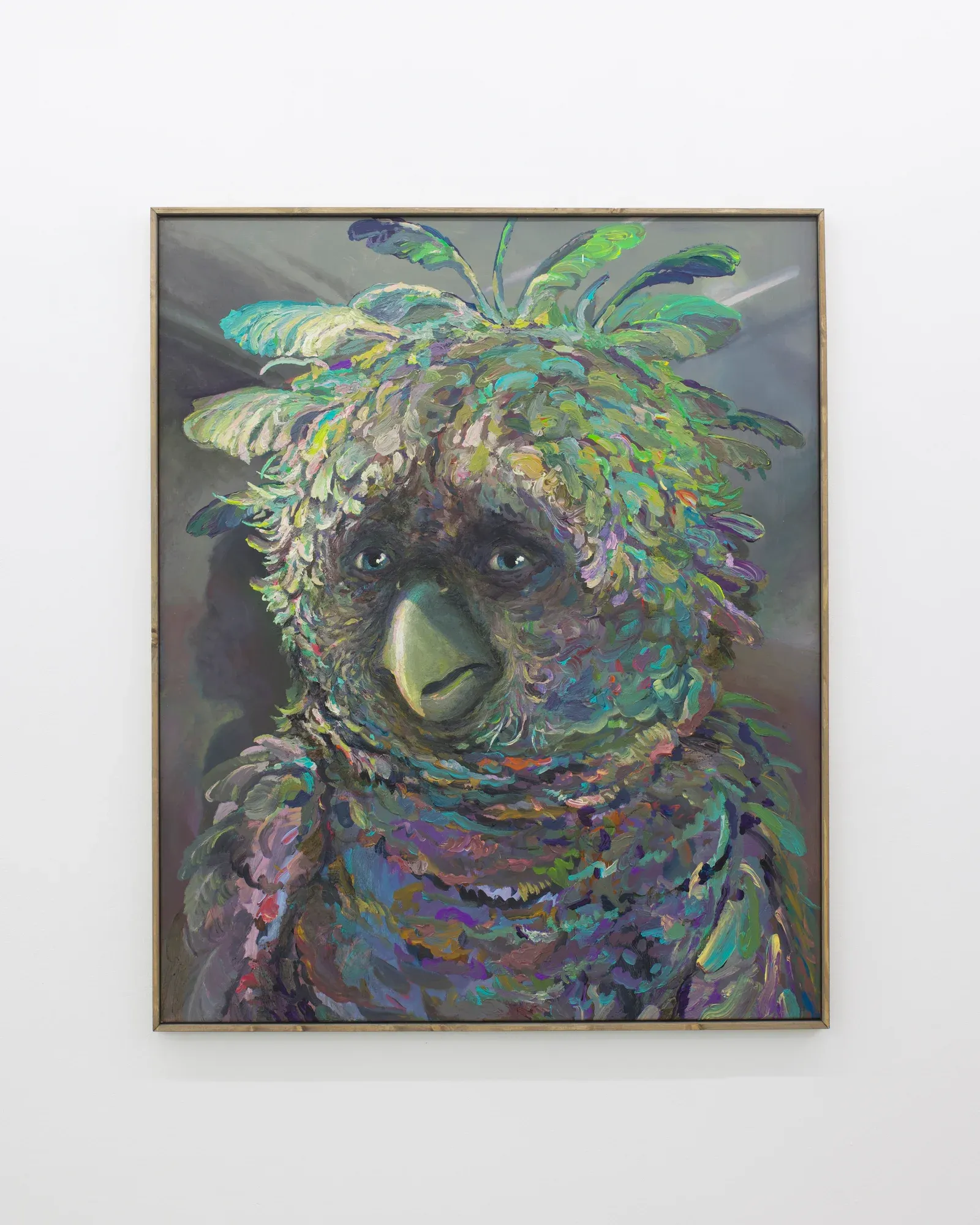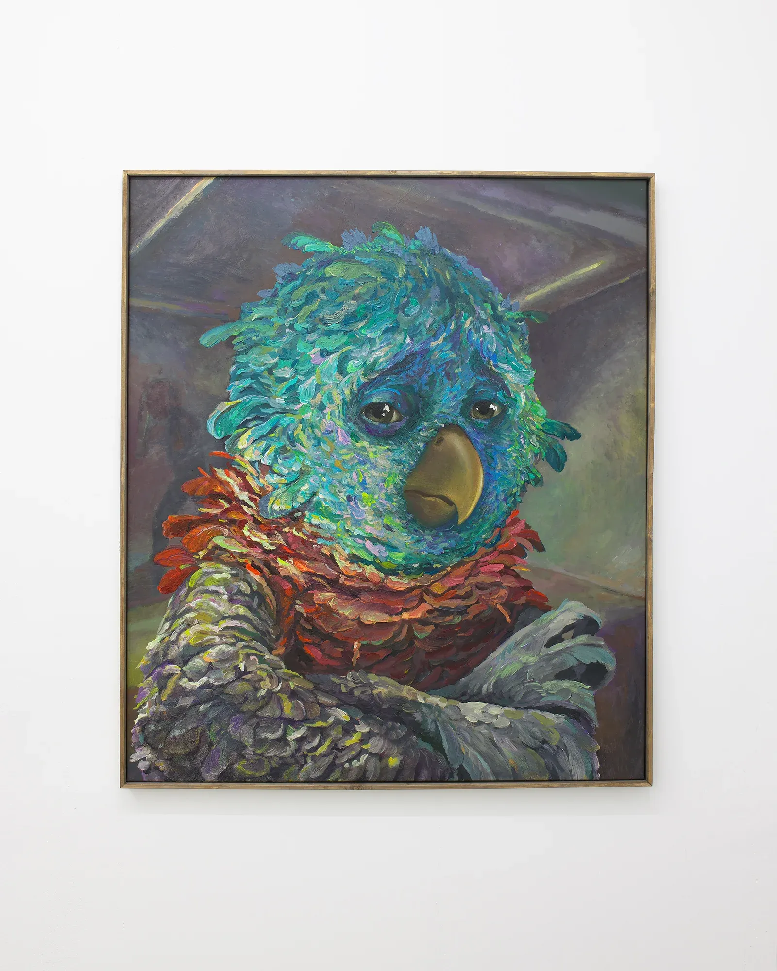 Michele Gabriele. Portrait of a Parrot. An Unbothered, Sad, and Cringe Parrot. Indifferent to its Context, from the solo show Brambora at Kaly Gallery, Lucerne, CH, 2025, acrylic on canvas, artist frame, courtesy of the artist and Kali Gallery, photos by Kim da Motta.