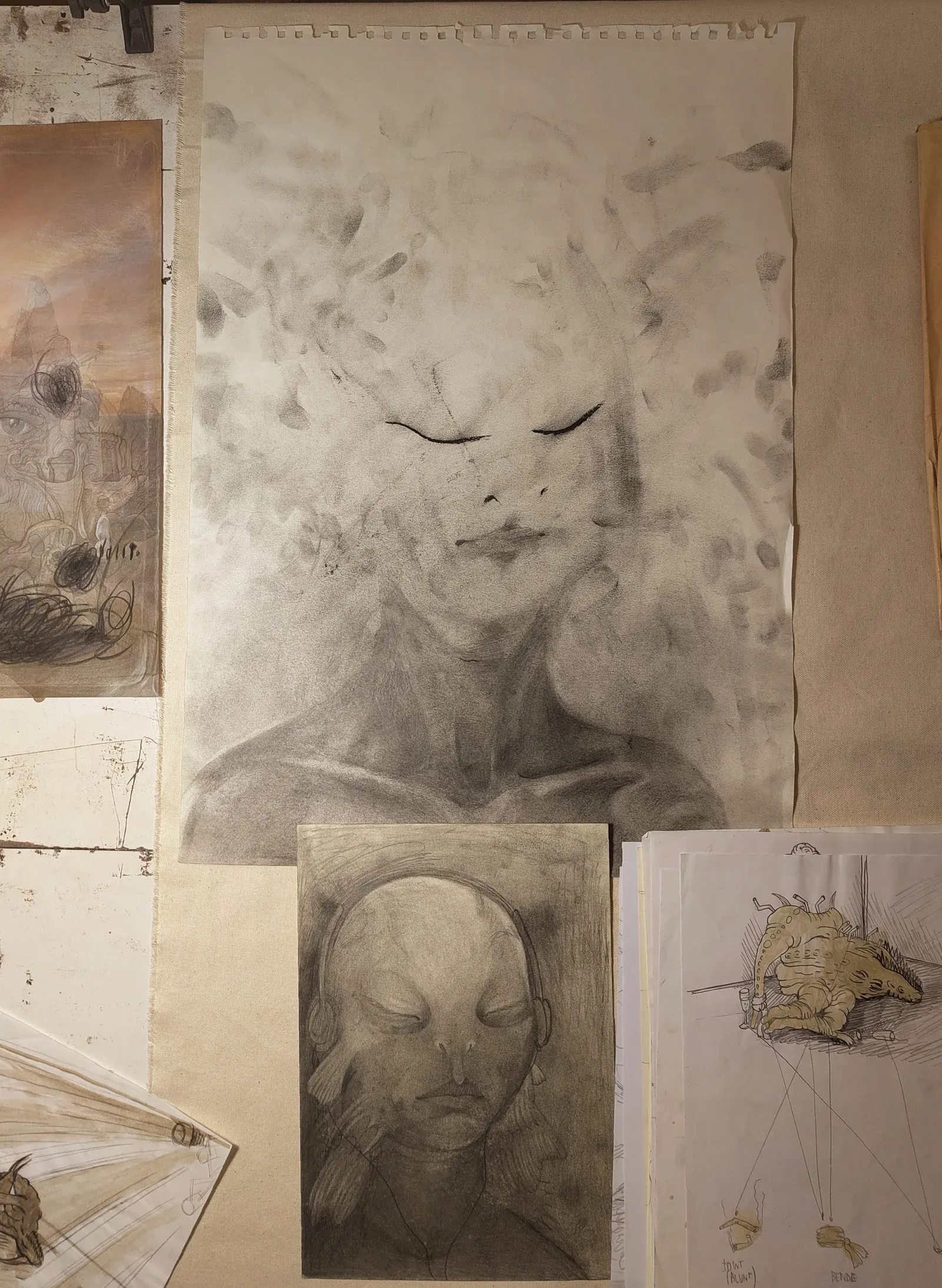 Fabric, paint, and surface interact without hierarchy. If the portraits feel like mirrors hung in public spaces, these studies resemble mirrors left in the studio, carrying traces of doubt, repetition, and physical labor.