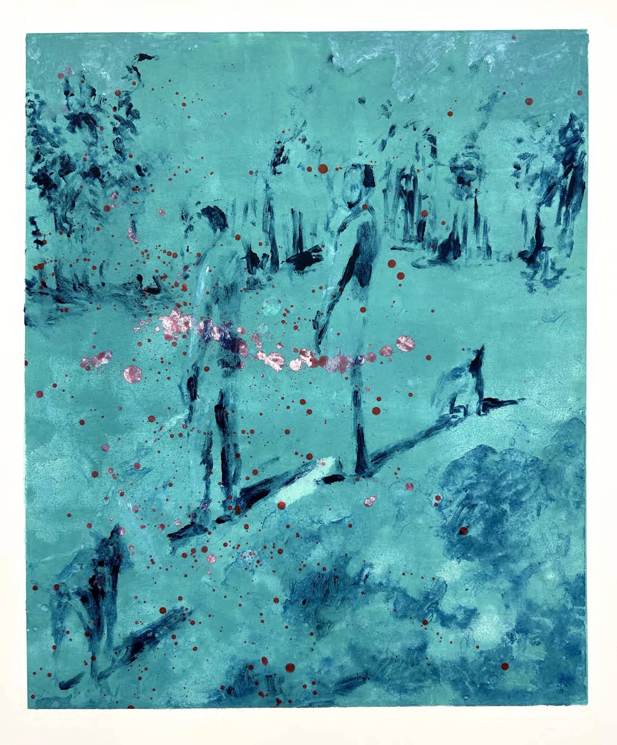 Oil and ink bleed into each other, cyanotype shadows drift across the surface, creating a liquid ambiguity.