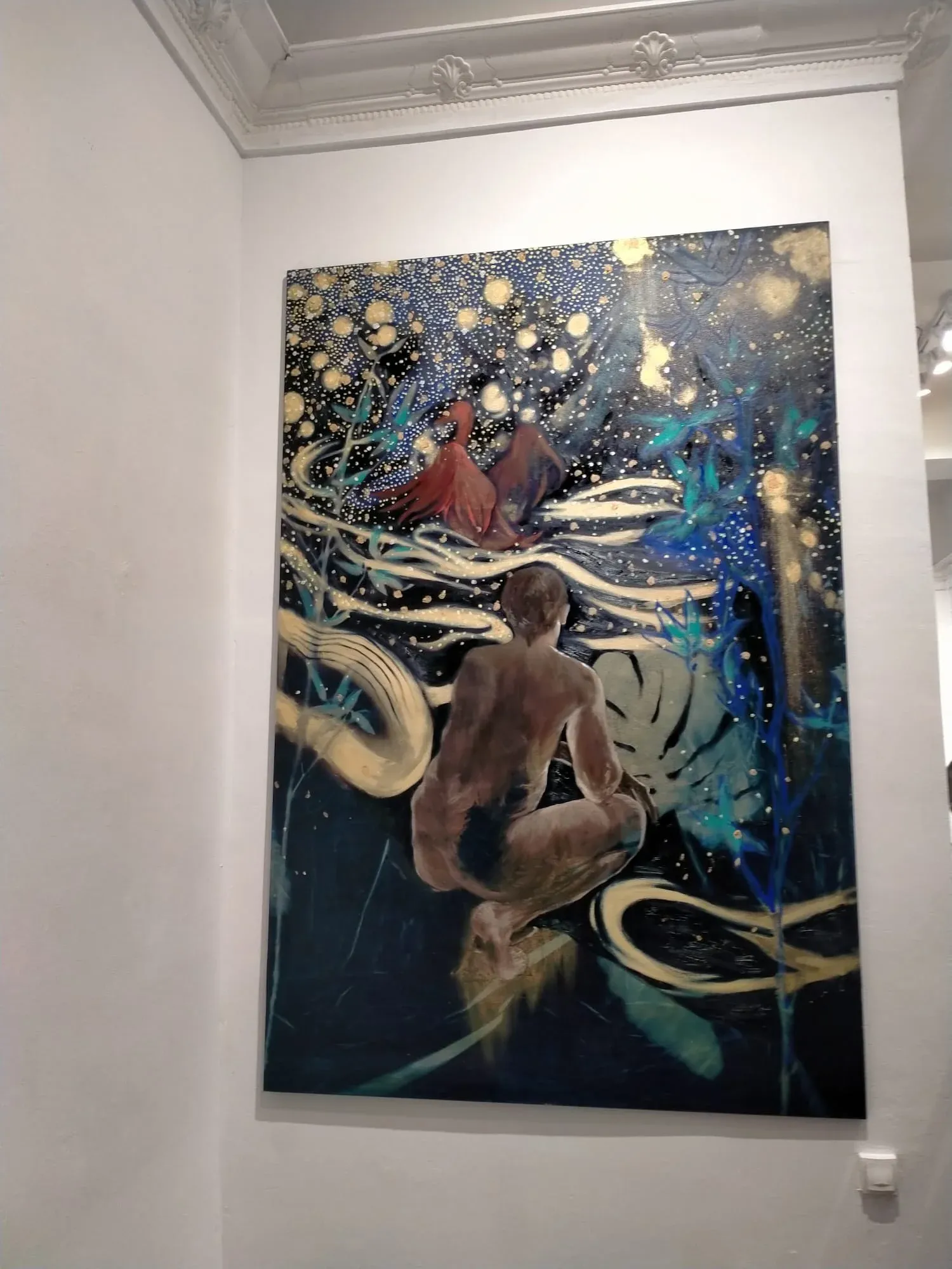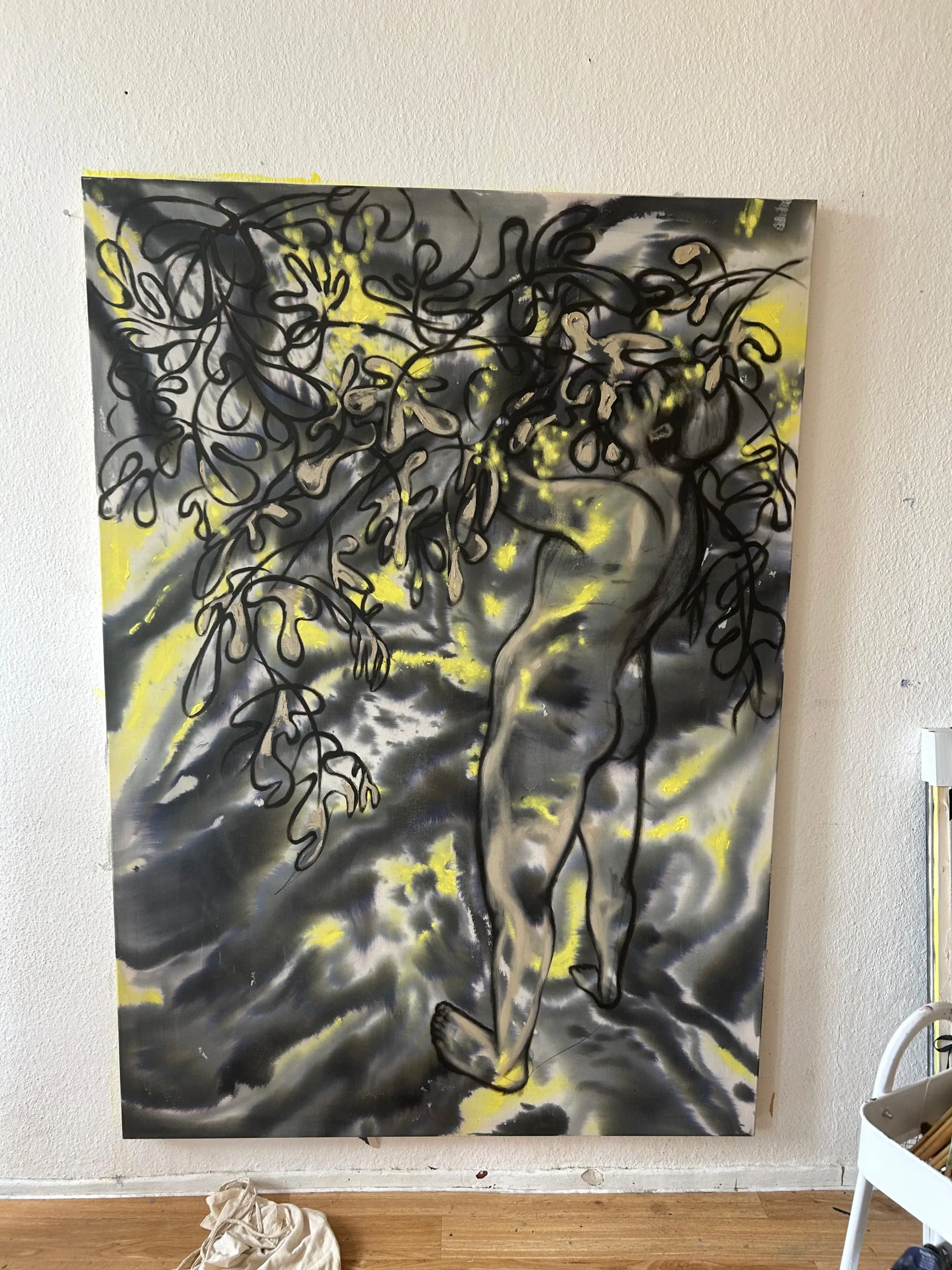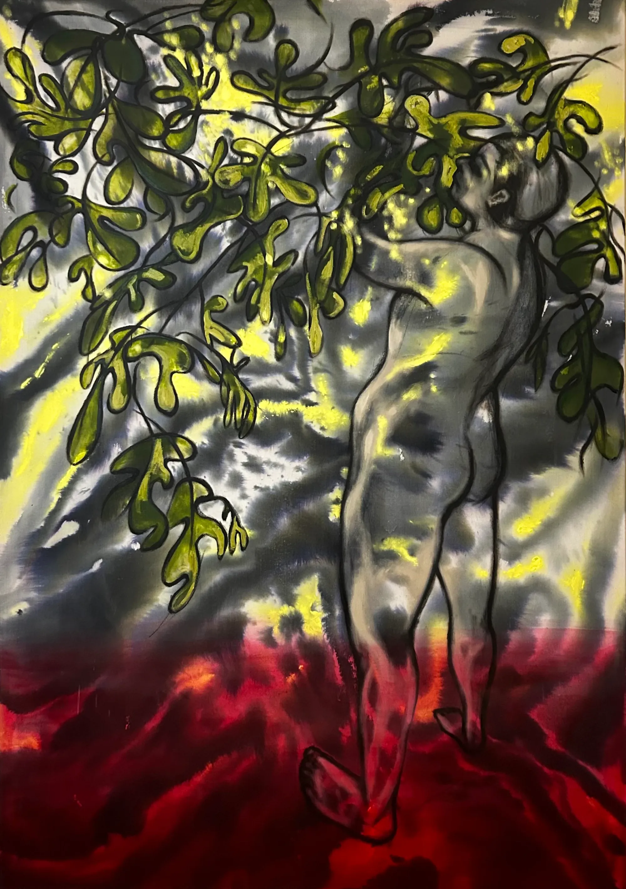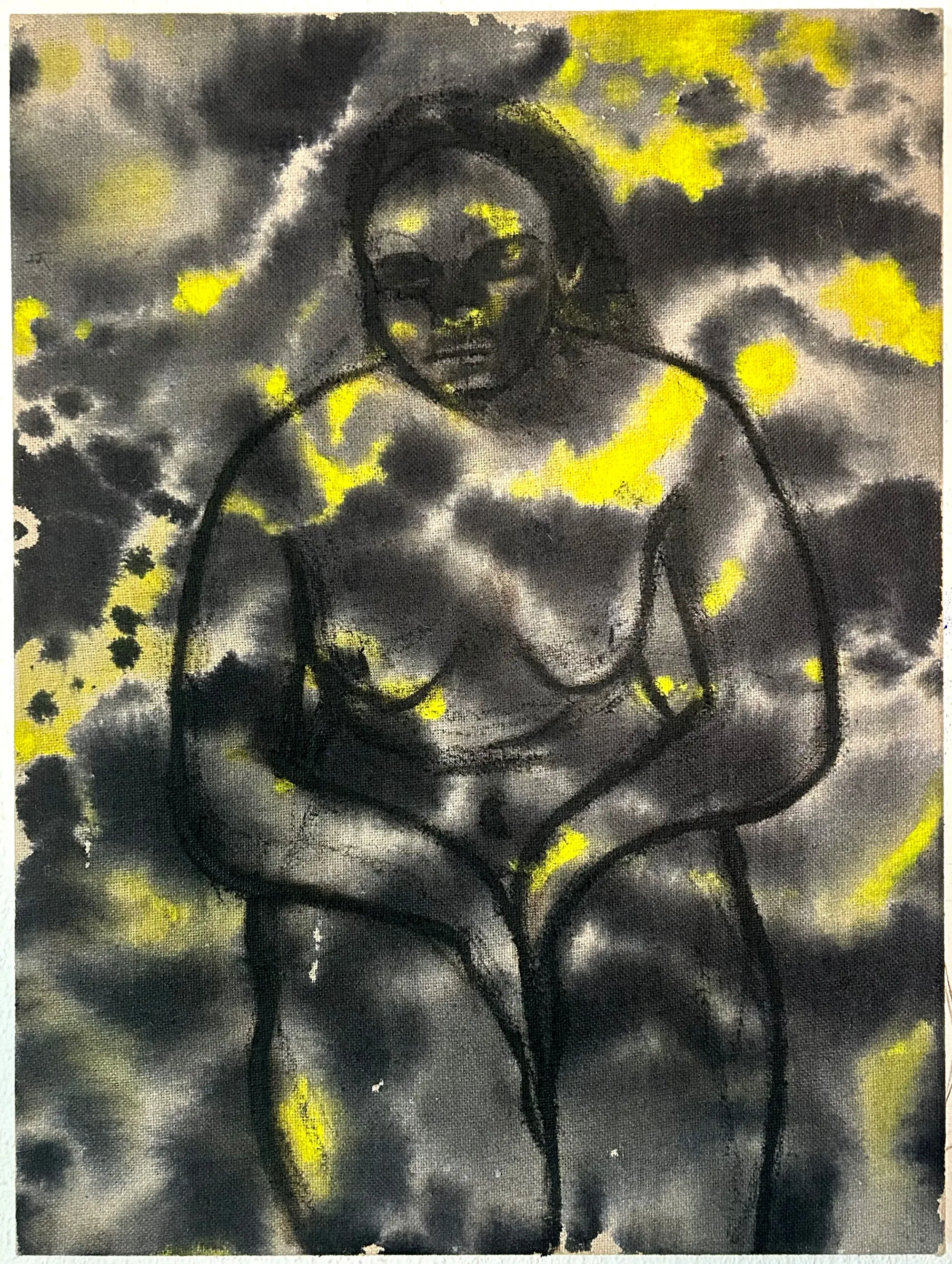 Oil and ink on canvas, cyanotype on jute, materials that feel alive, like skin absorbing and releasing memory.
