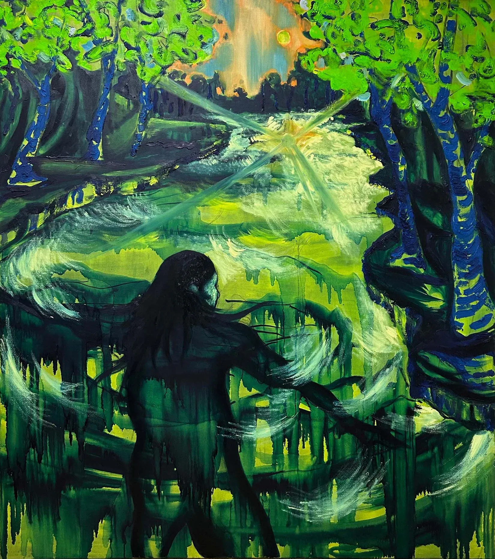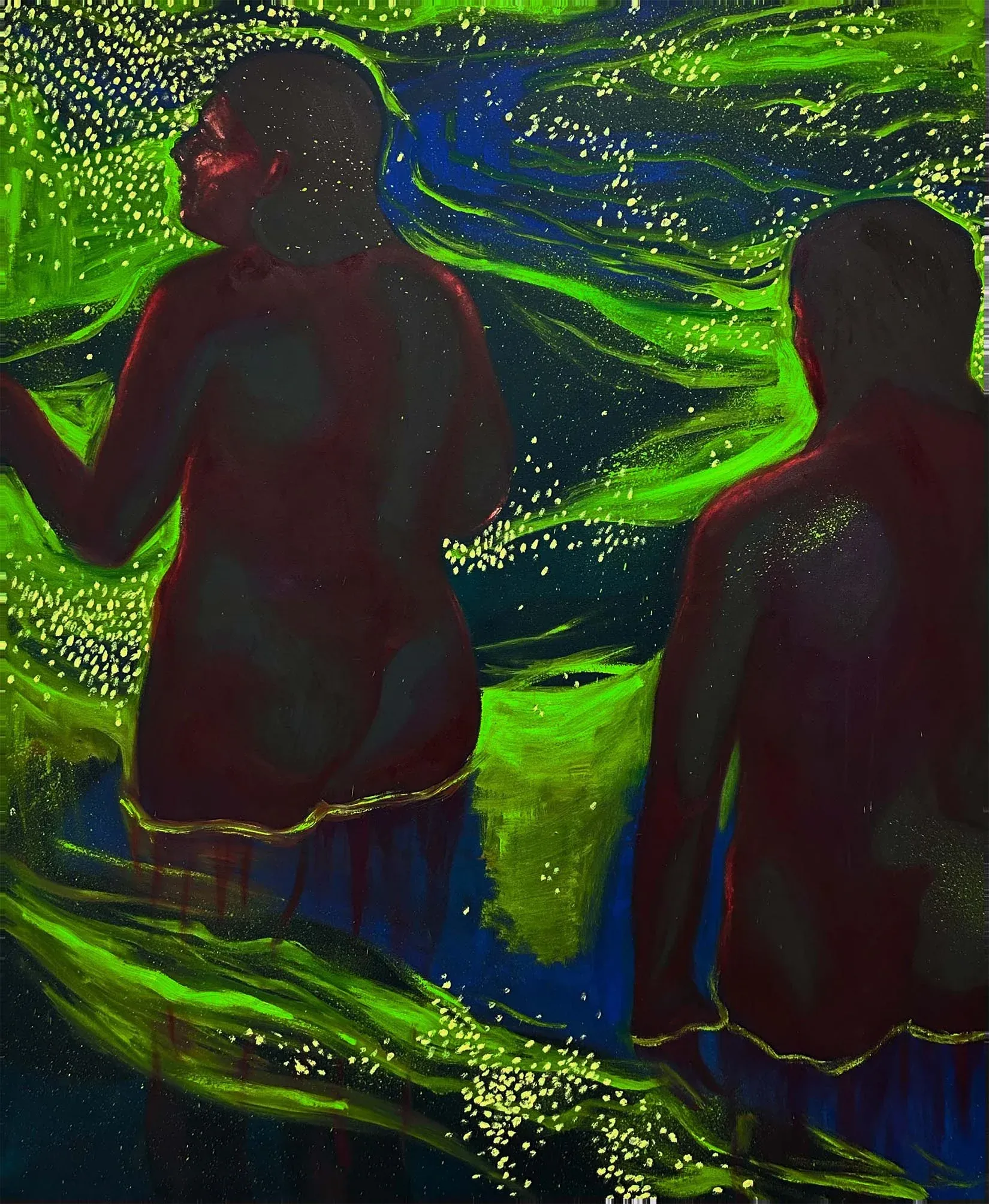 But unlike the sunlit bathers of art history, her scenes glow in unnatural green.