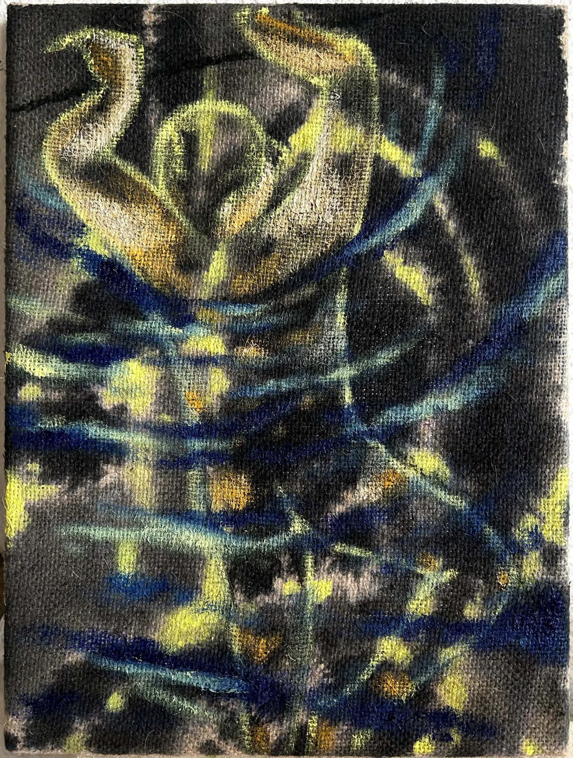 Candy Bassas: On the left: Landscapes at night - your treasures I, 2025, 24x32 cm Oil, acrylic and ink on jute and on the right: Landscapes at night - your treasures I, 2025, 60x80 cm Oil, acrylic and ink on jute