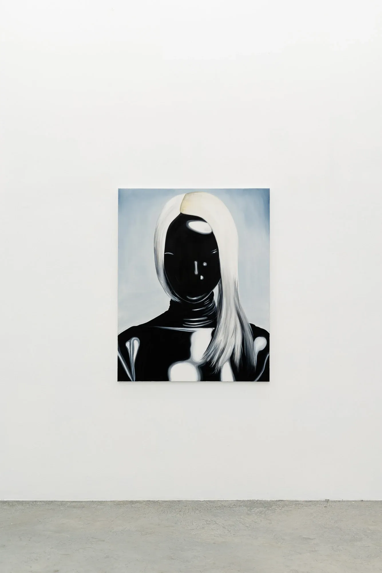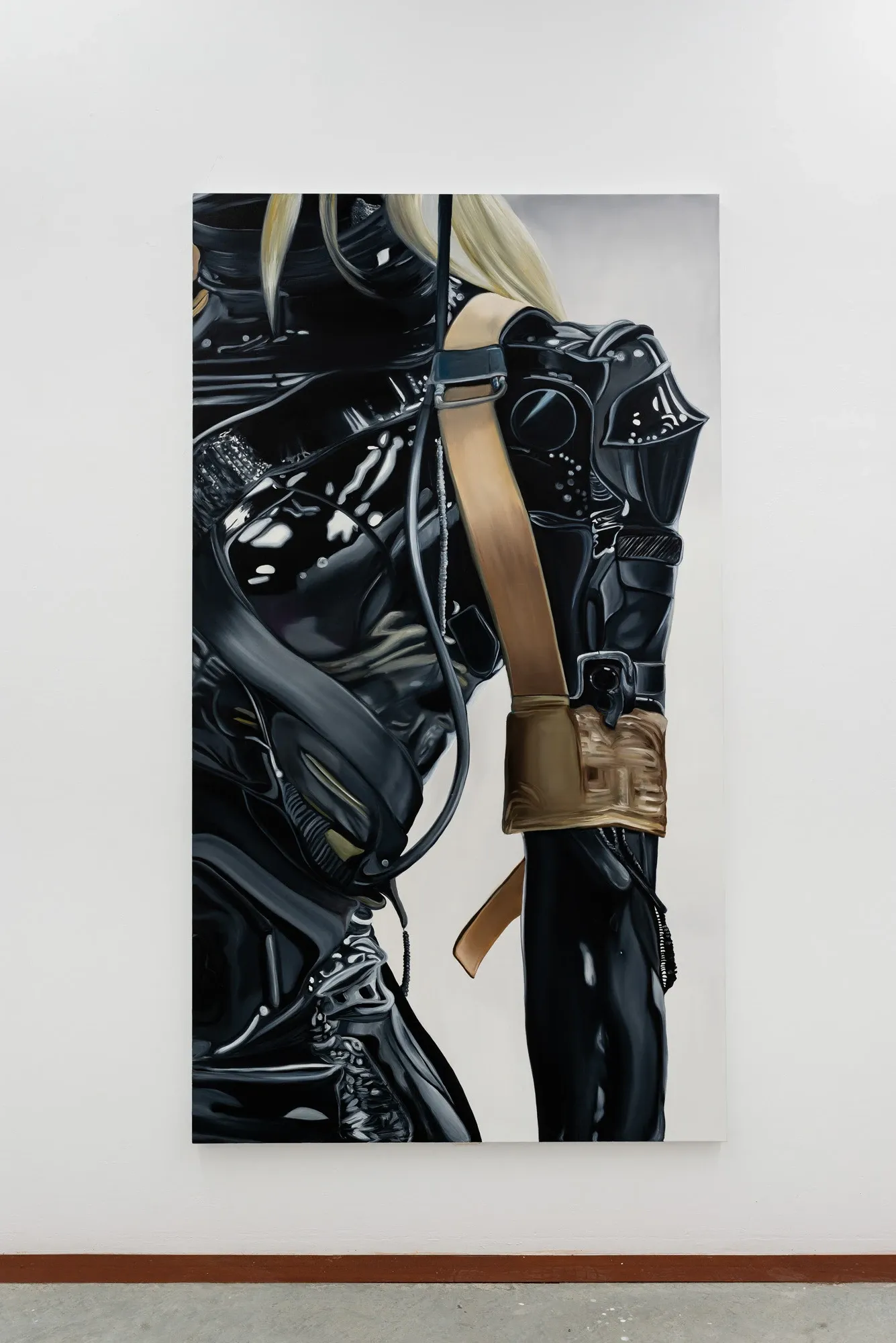 Her paintings respond with quiet ferocity: padded lovers locked in glossy embraces, latex-coated torsos, hands in surgical gloves steadying needles, black cats swimming through impossible depths.
