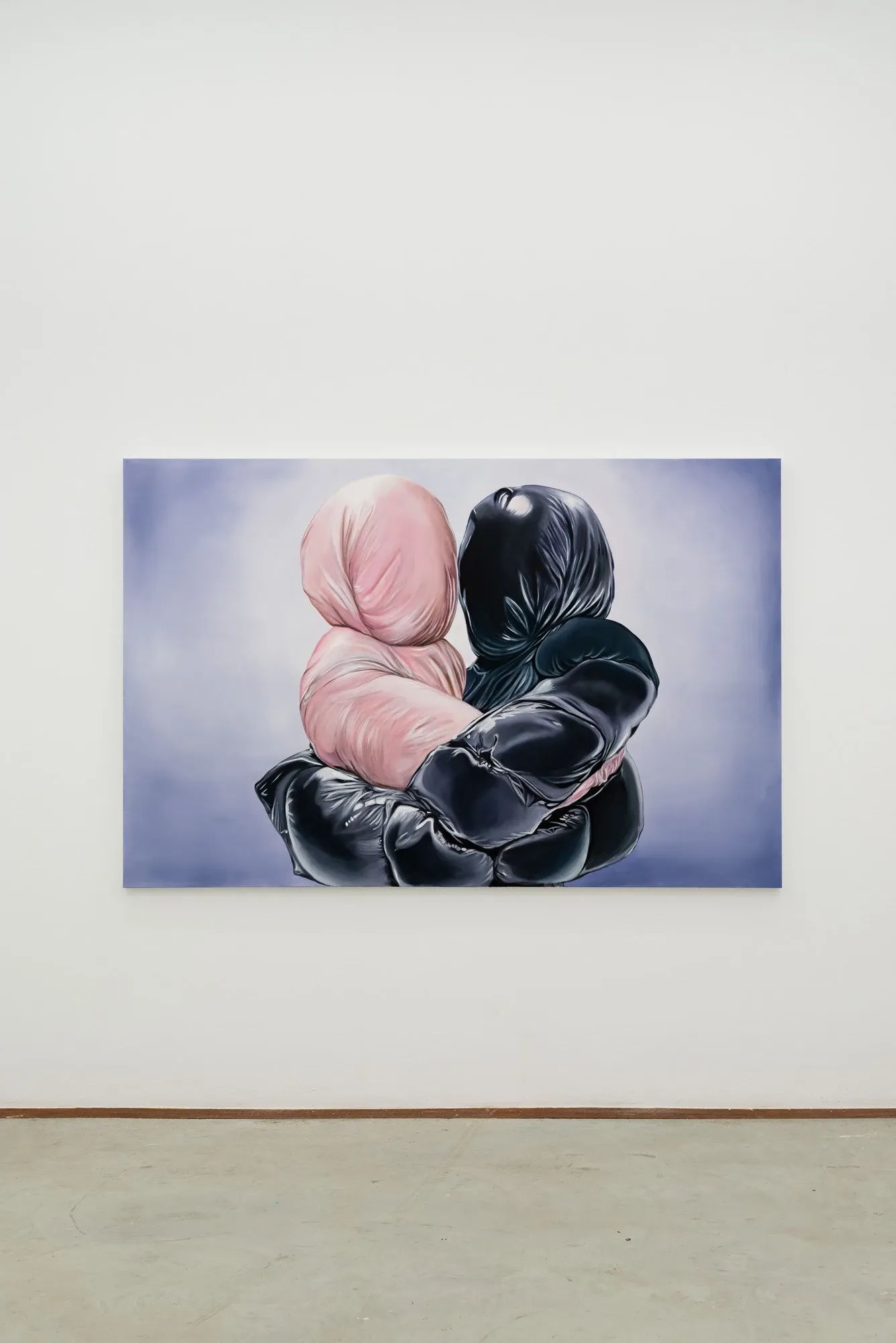 The padded figures clinging to one another aren't just fetish objects. They're archives of touch, storing warmth the way synthetic fabric holds heat.