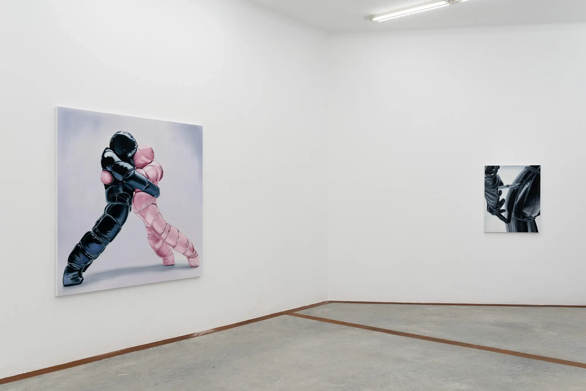 Charlie Stein Everything Not Saved Will Be Lost exhibition view CCA Andratx showing padded figures in glossy embrace - Installation View - Image Courtesy CCA Andratx