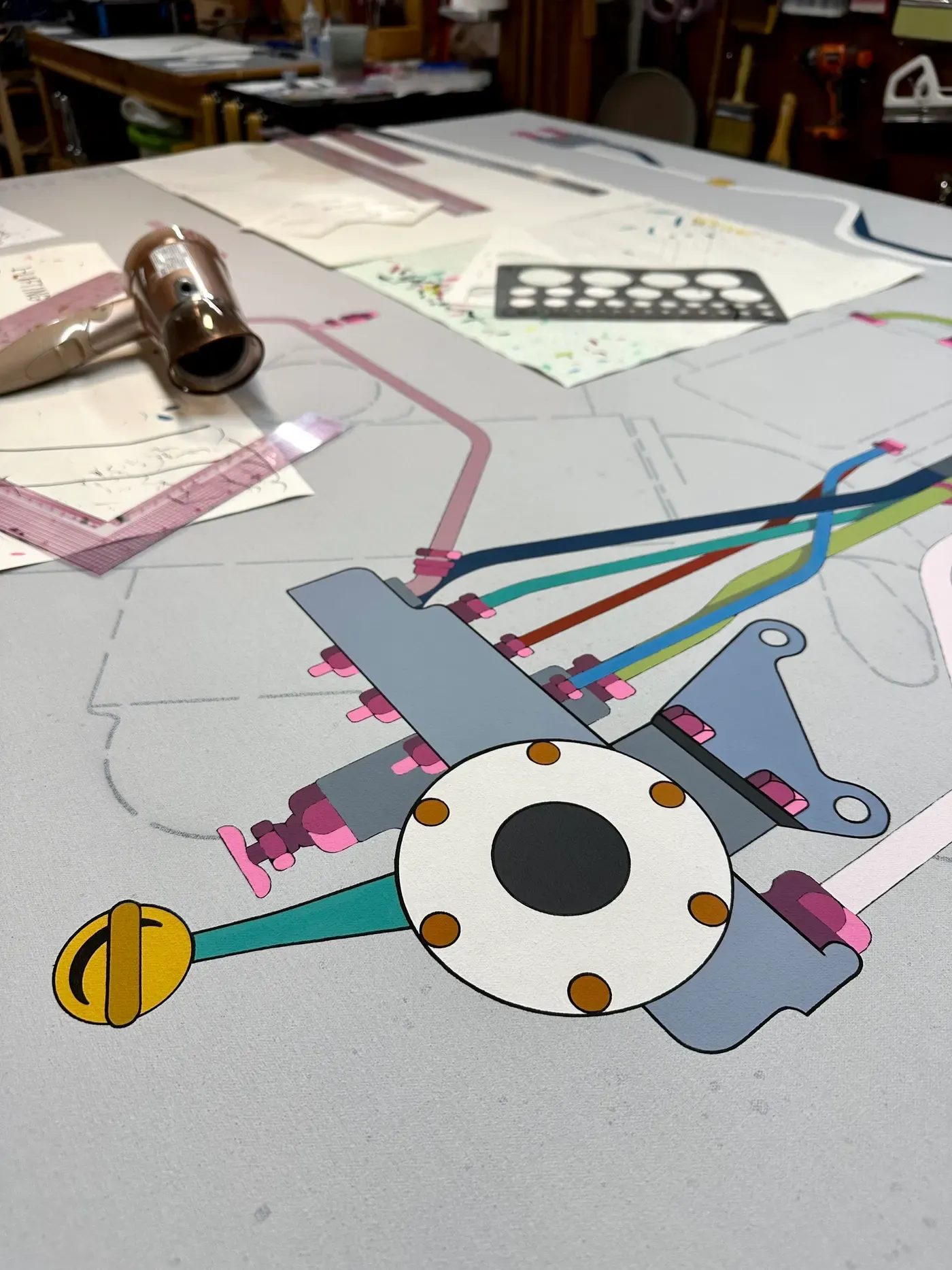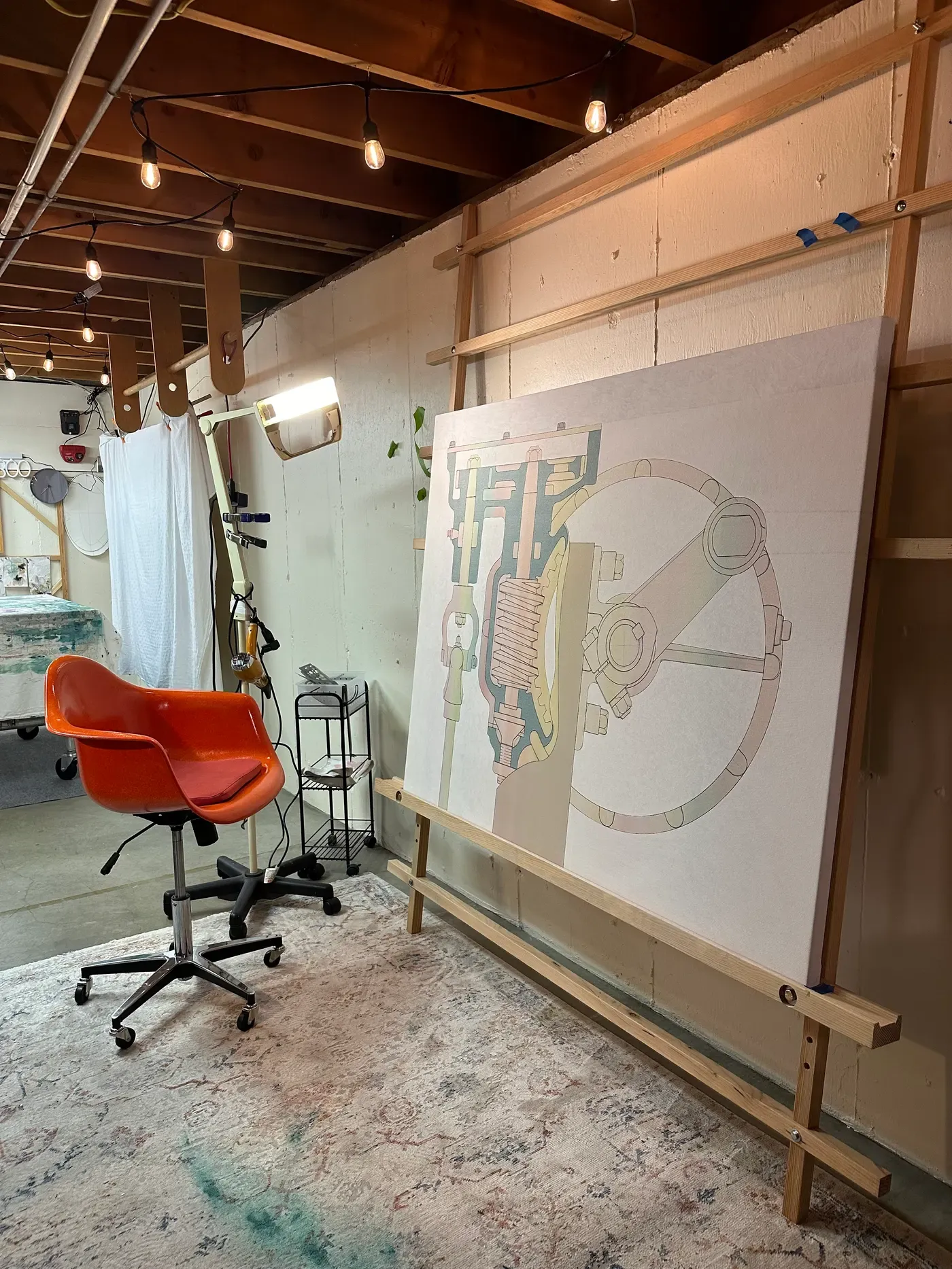 His pictorial work draws inspiration from machinery, technical manuals, and industrial forms, transforming functional imagery into something poetic and visually engaging.