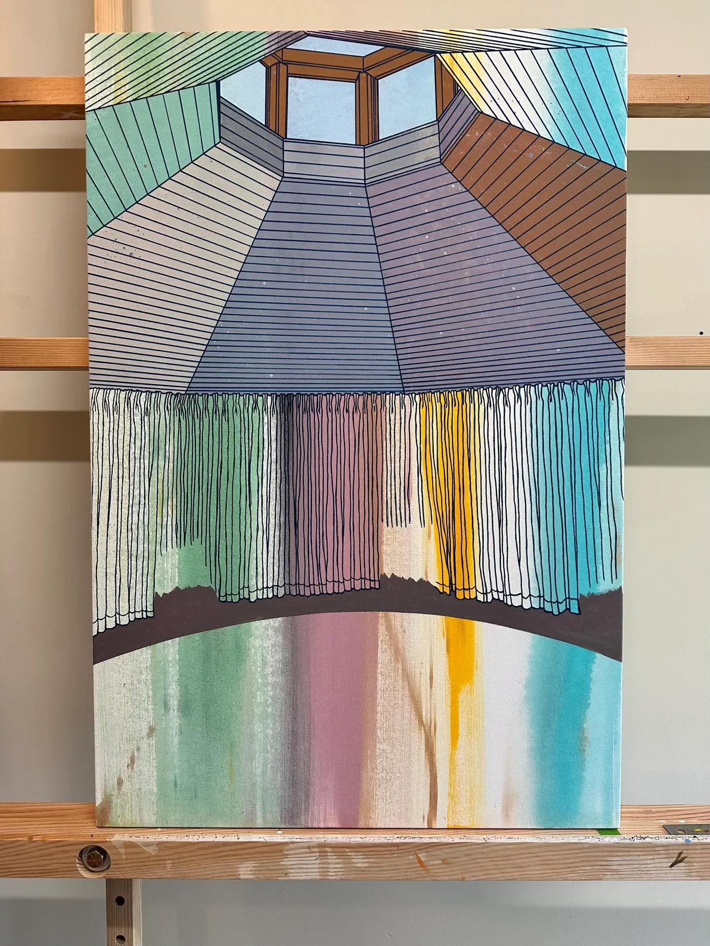 Chris Cassimatis, studio views and works in progress. These panels show the two poles of his process: atmospheric color fields built through slow layering, and architectural linework mapped with precision. Together they reveal how intuition and structure intertwine long before a painting reaches its final state. Image Courtesy of the Artist.