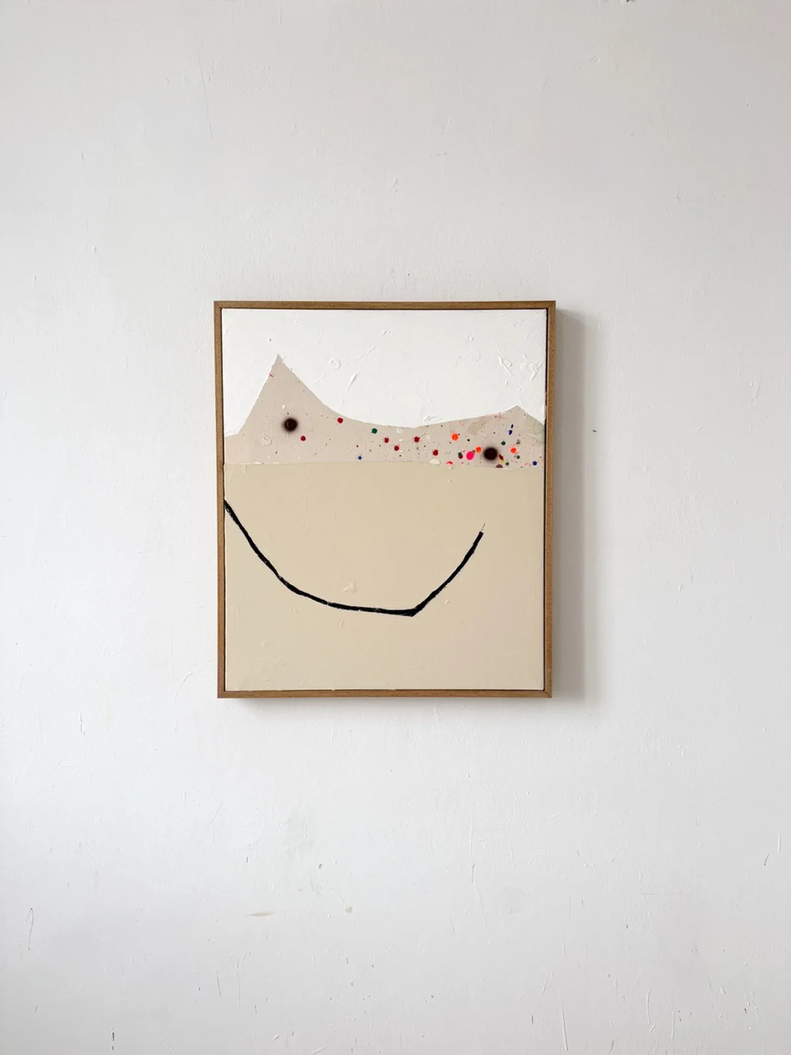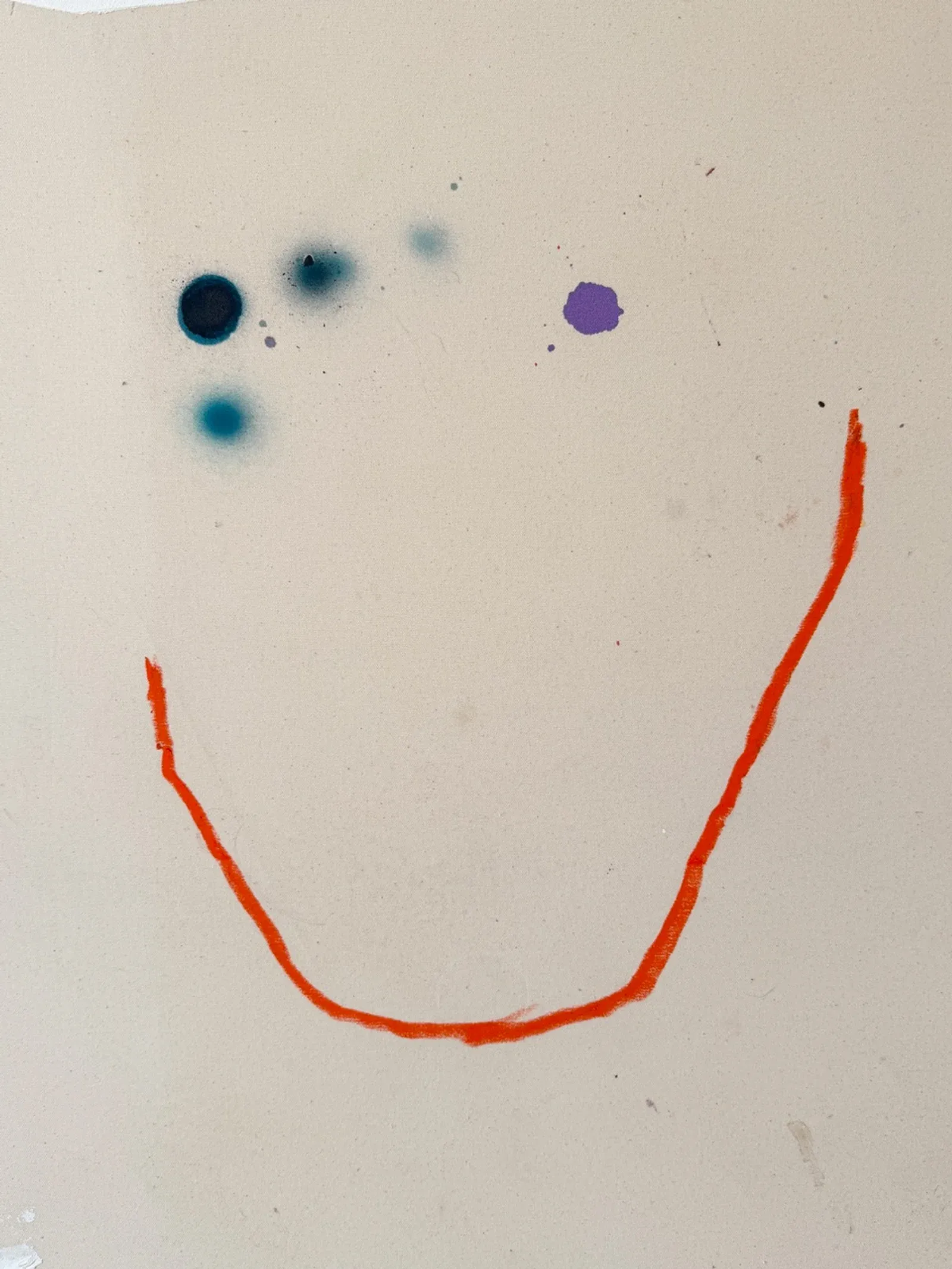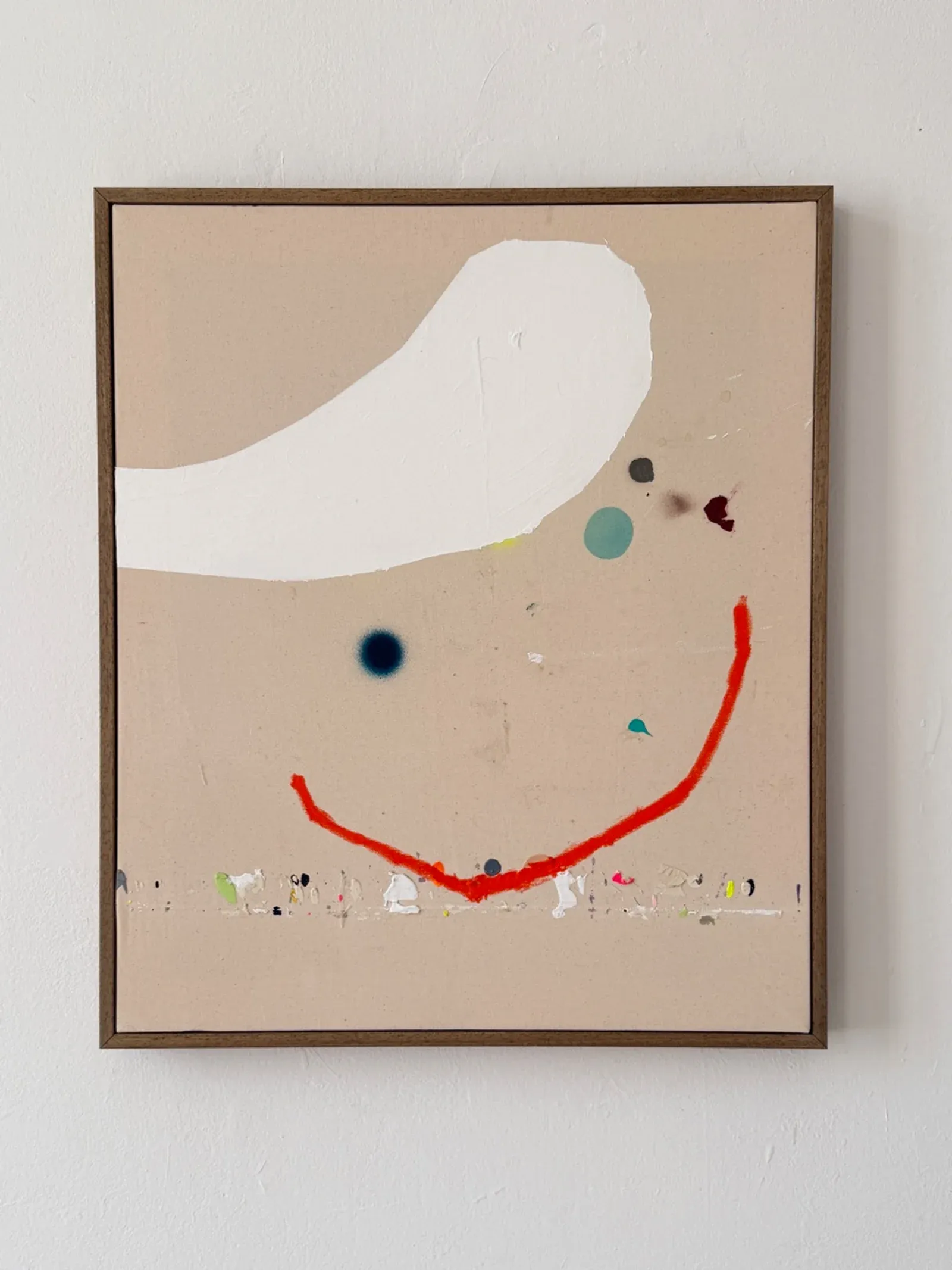 The paintings move between abstraction and figuration, between deliberate placement and events that resist control. A limited set of elements, arcs, dots, fields of white, stains of color, is repeatedly tested until the composition settles into a dynamic balance.