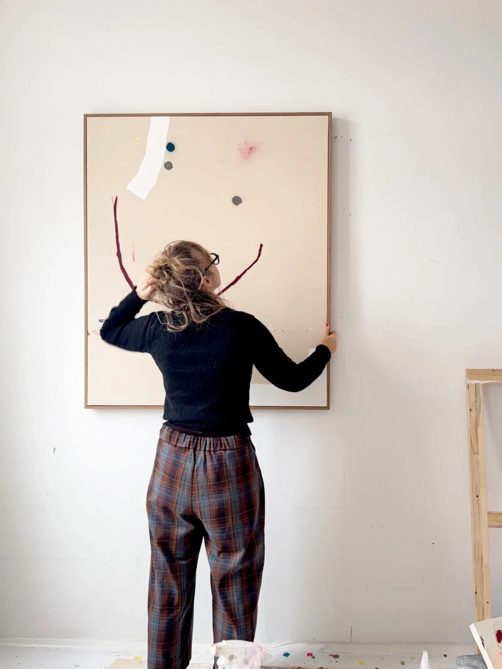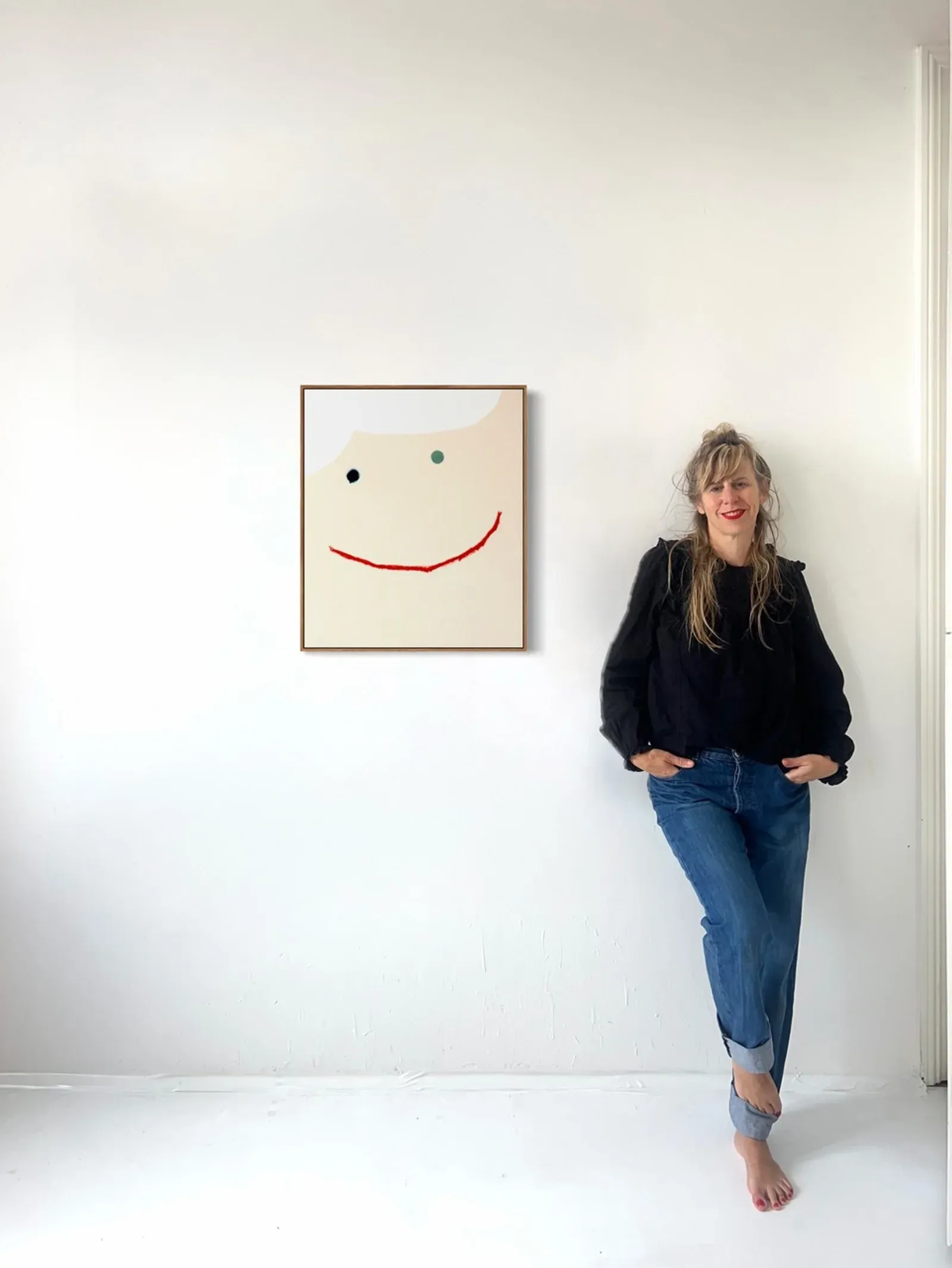 Christina Gschwantner in her Studio - (left) HAPPY FACE, 120*100, mixed media on raw linen, 2025 (right) BIG SMILE, 65*55, mixed media on raw linen, 2026 - Image Courtesy of the Artist