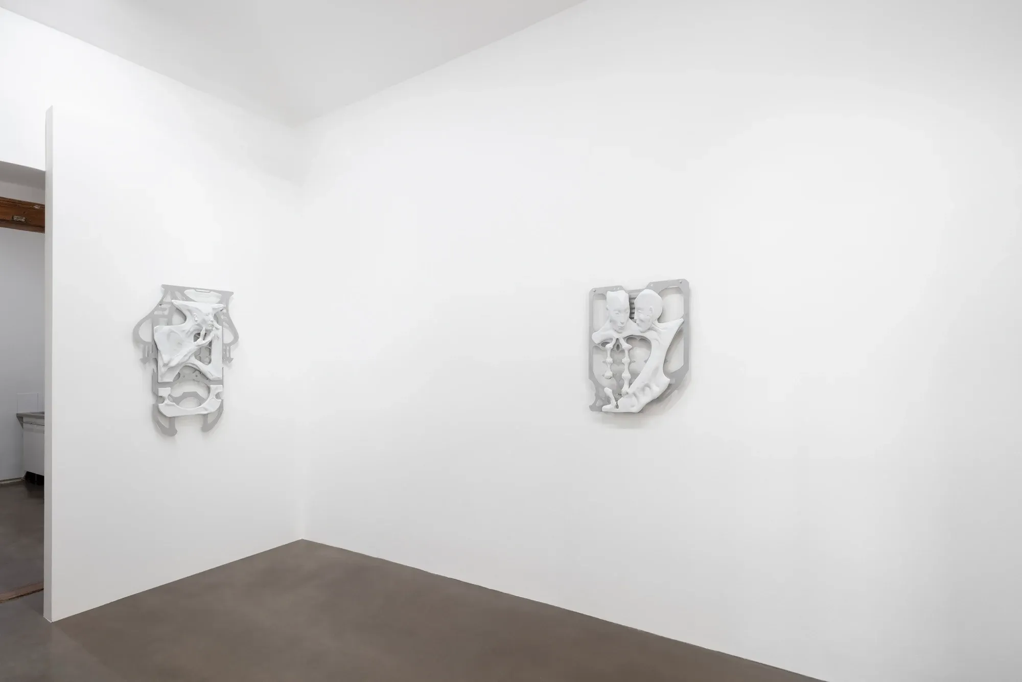 Paula Gogola’s exhibition soft_sighs synthesis extends painting into sculptural relief. The works move between image and object, where softened bodily forms appear suspended inside shallow architectural frames.
