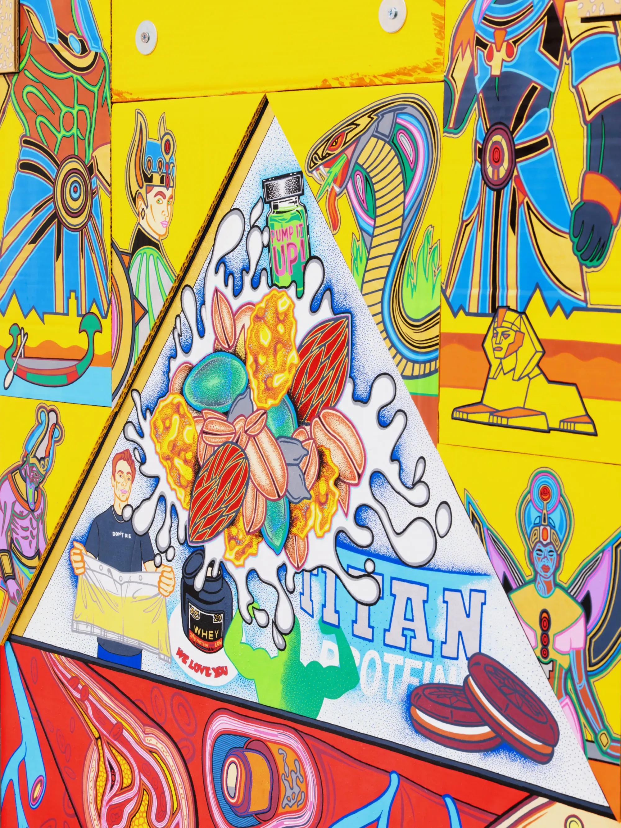 Her sustained project, what she calls "post-fairground attractions", takes the visual logic of amusement parks and travelling fairs and reads it against contemporary wellness culture: the graphic intensity, the advertising language, the way spectacle shapes conviction before thought arrives. She is interested in how effects work. How ornament makes a claim. How a slogan turns a gym into a temple, or a temple into a gym.