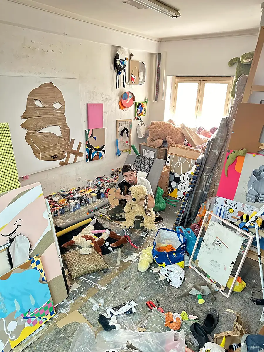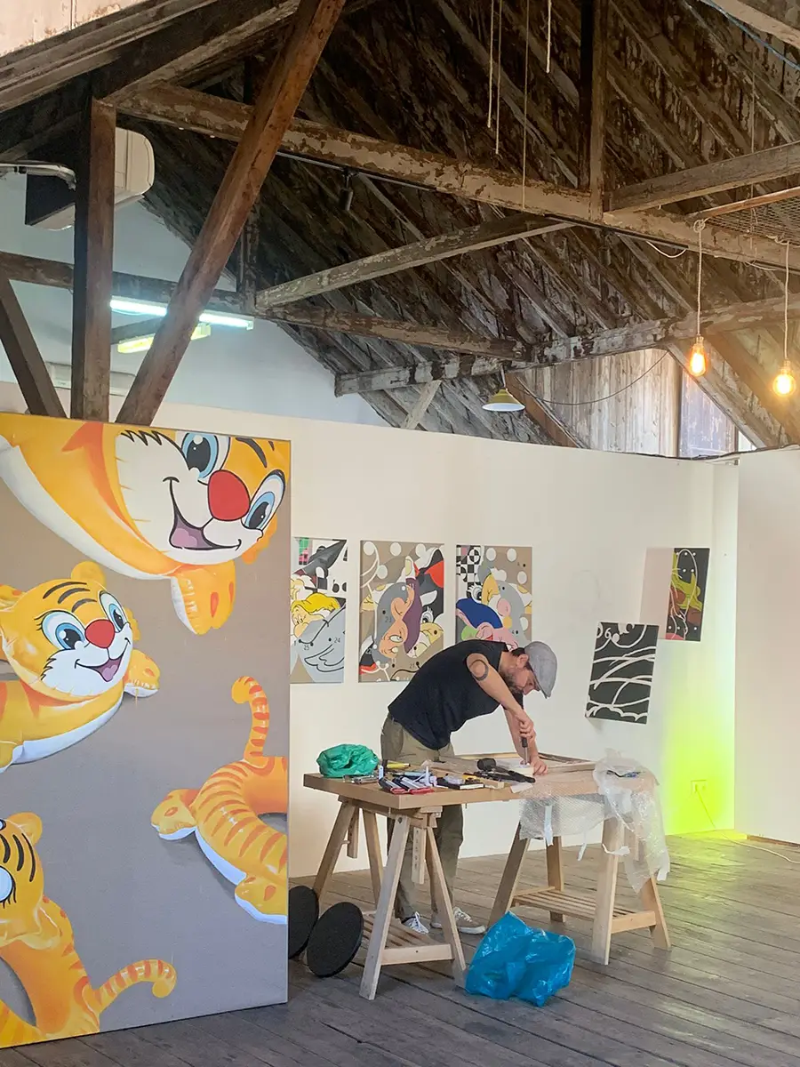 David Rosado: left -> Artist in his Studio working on "Froggy fresh, 2023" and Froggy fresh, 2023 ( Installation View) | Image Courtesy by the Artist