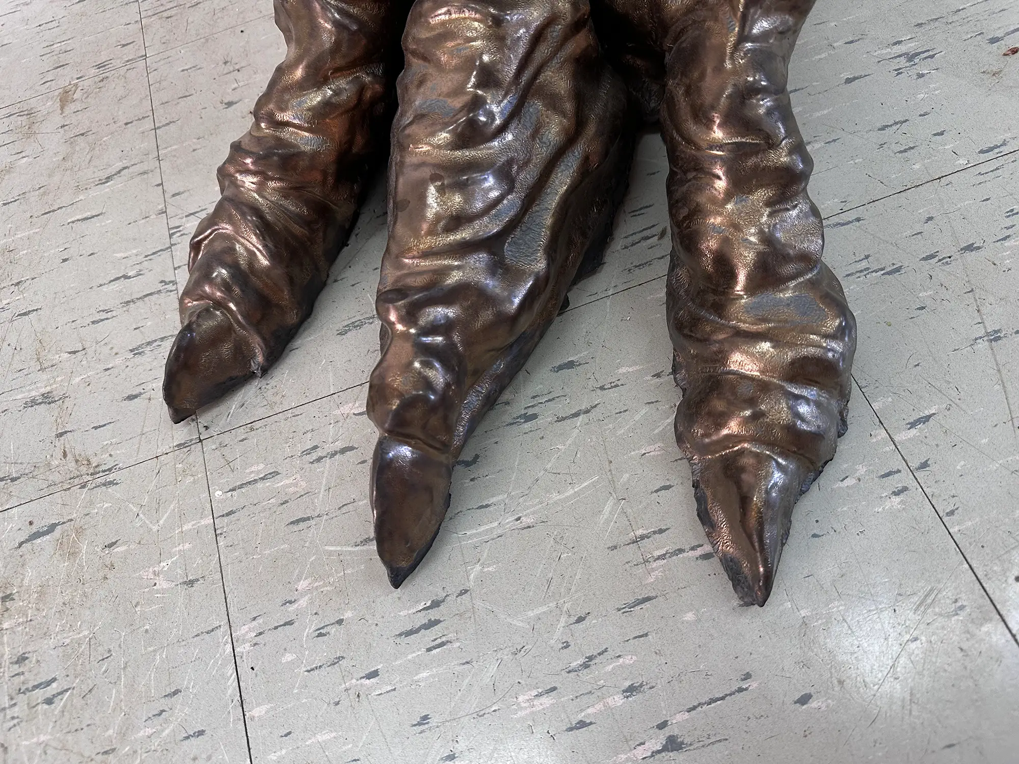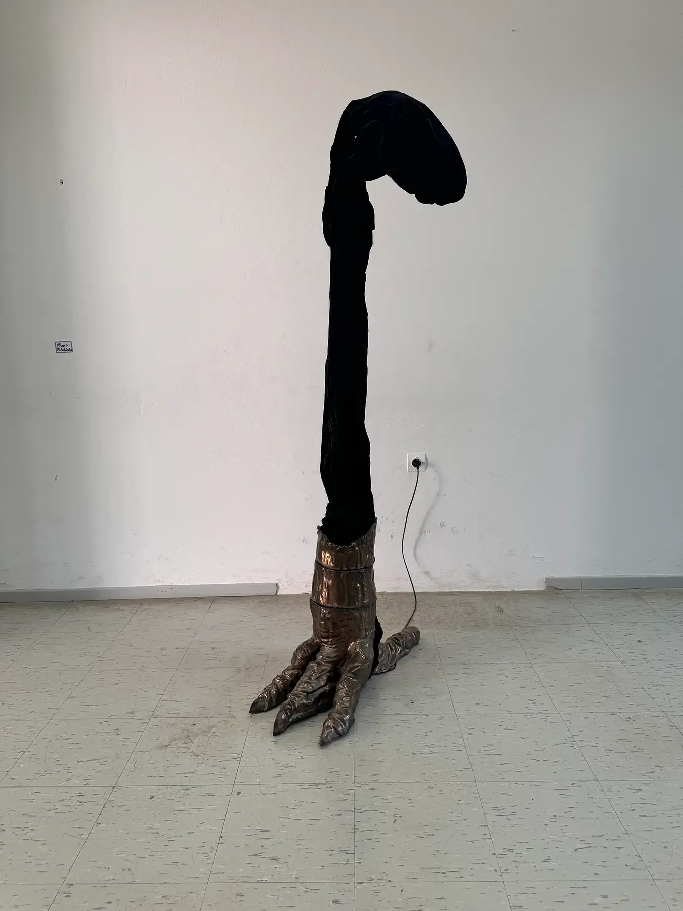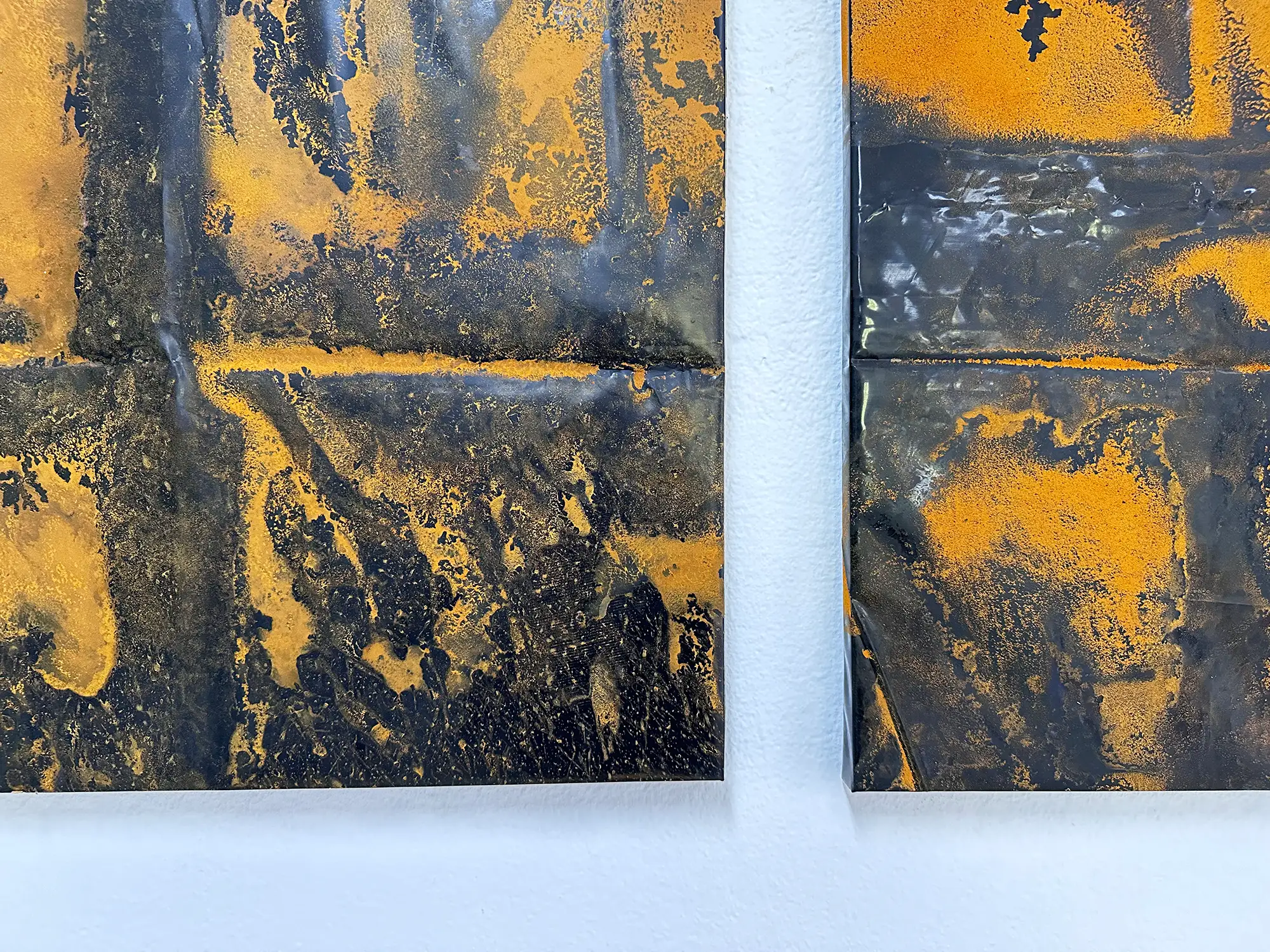 Her works, spanning sculpture, painting, and digital media, create immersive installations that examine the processes of oxidation, decomposition, and transformation.