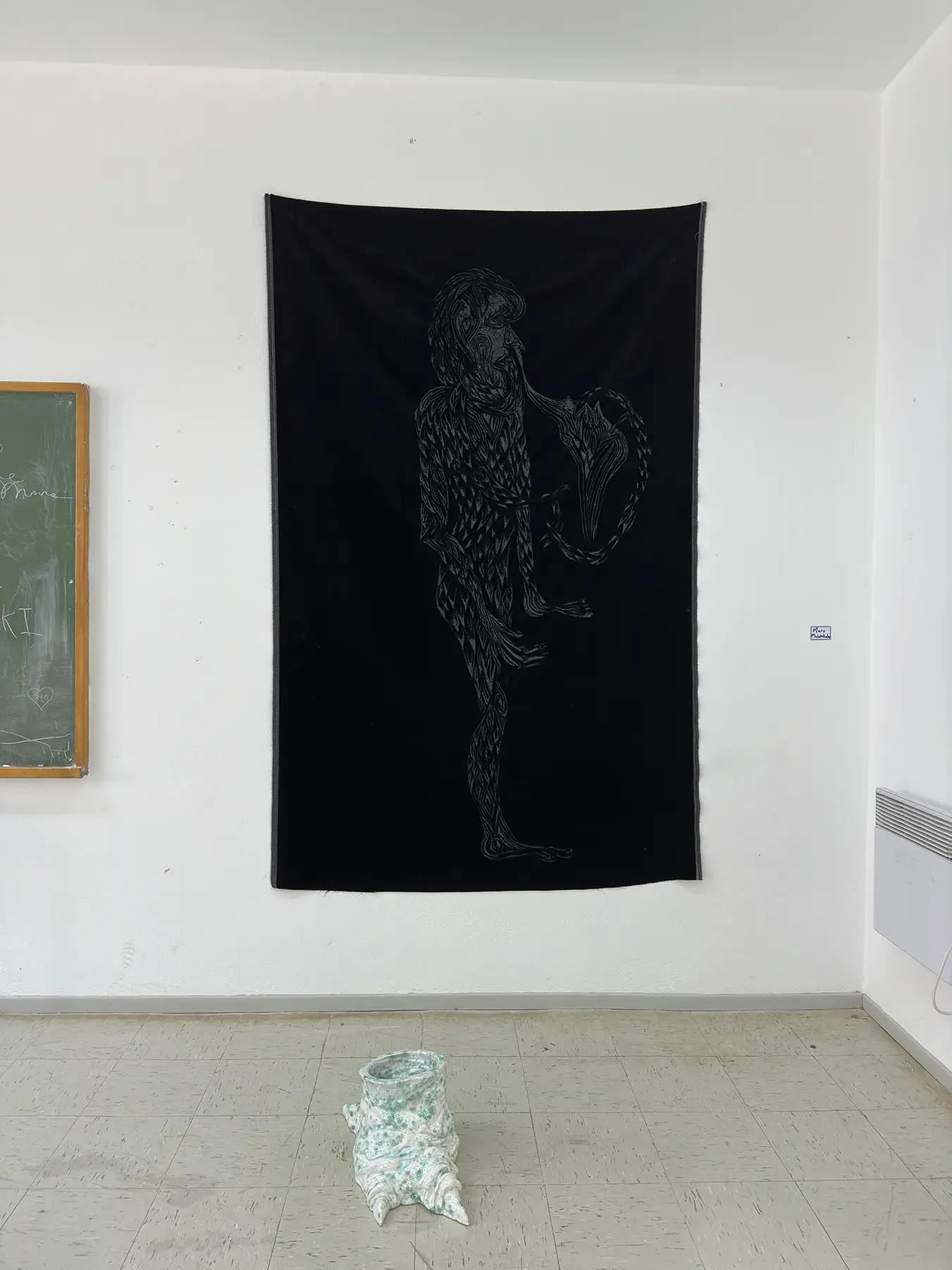 Michalakakos' installations are philosophical realms filled with intense figures and themes, characterized by a refined rawness that draws viewers into a liminal space.
