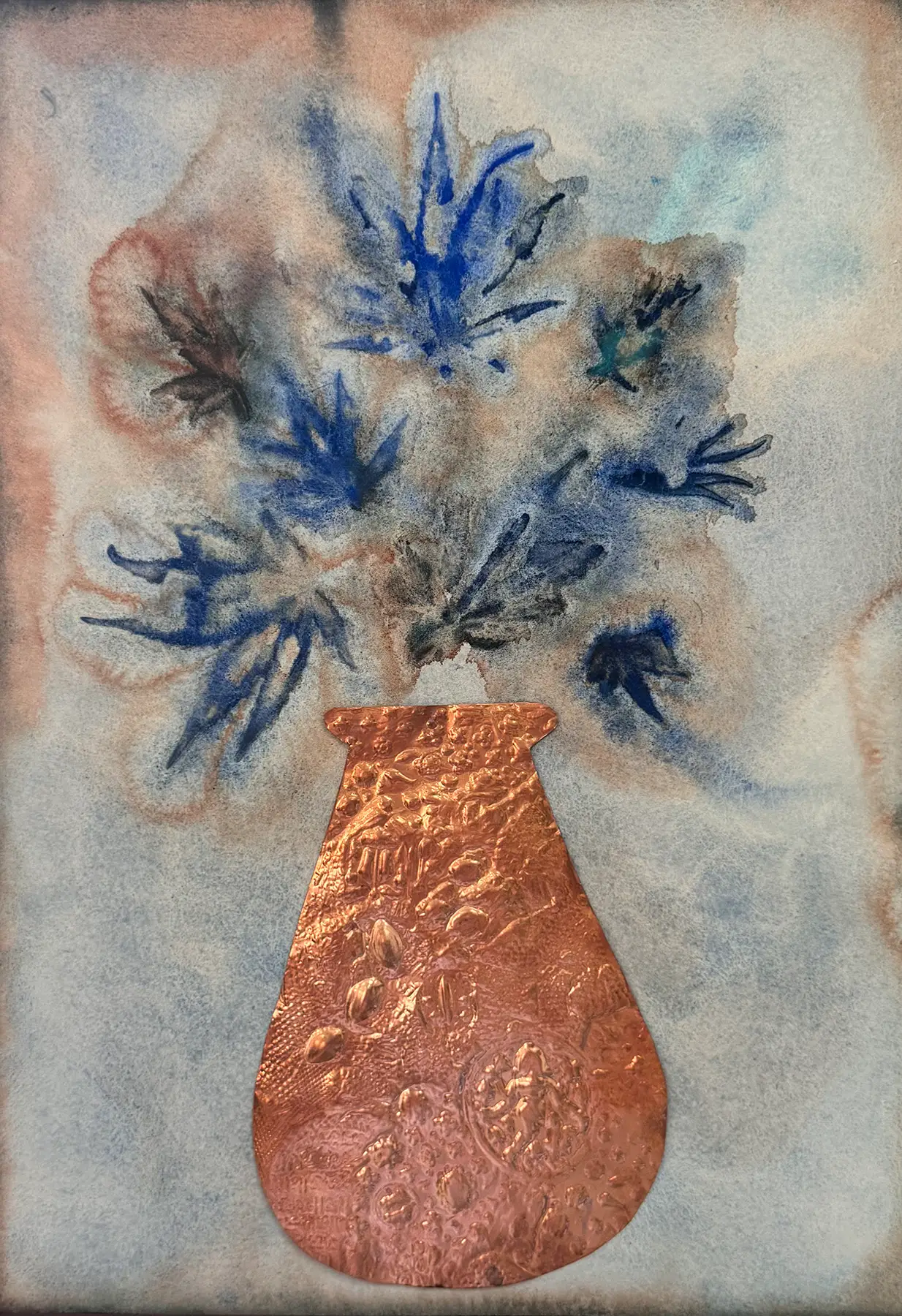 Her latest series, "Vessels," melds watercolors with copper and steel, exploring the delicate balance between nature and the human-made.