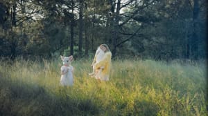 The eyes are glassy and watery, as if they’ve just stopped crying or haven’t started yet. And then there are the rabbits: fragile, tender, ever-watching. They’re not sidekicks. They’re witnesses.