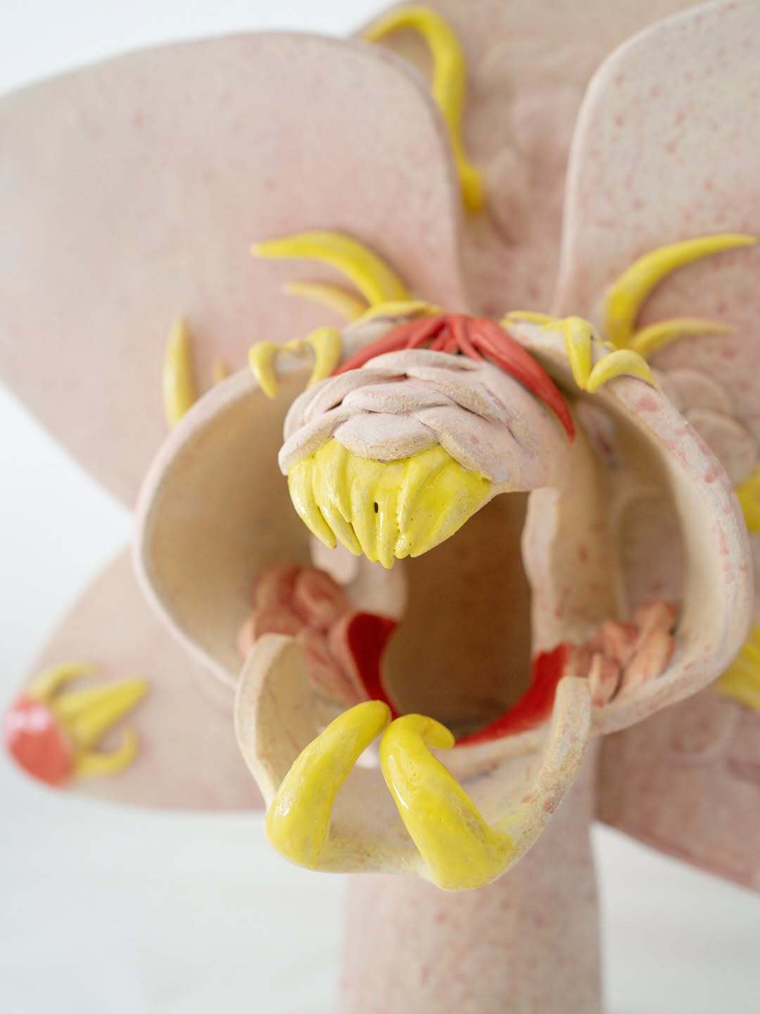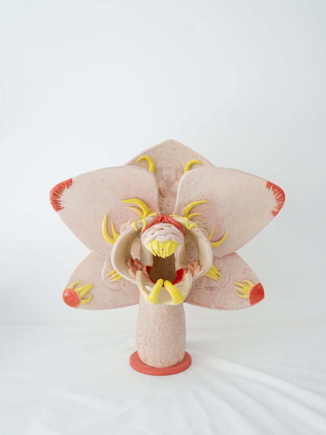 Eri Maeda, Orchid Monster, 2025. Ceramic. A hand built sculptural creature with petal like forms and sharp yellow details, part of the artist’s ongoing series exploring beauty, tension, and emotional disguise. Image courtesy of the artist.