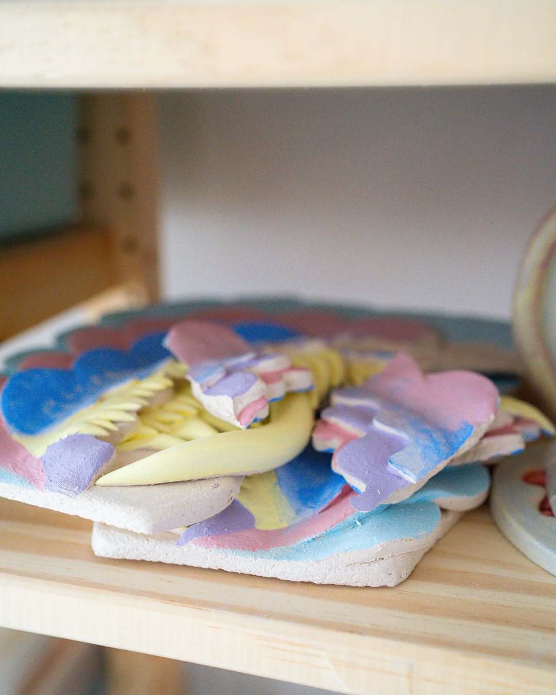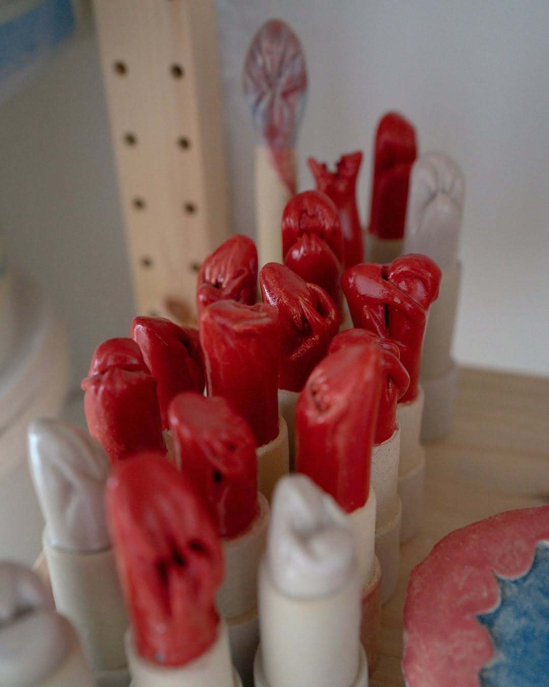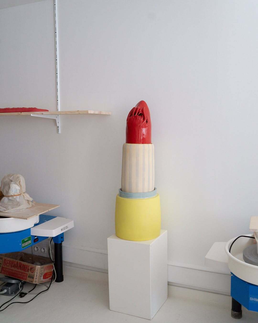 Studio shelf view with Eri Maeda’s ceramic pieces, including finished works, fragments, tests, and works in progress. Lipstick forms, Monster Comb elements, mirror components, and new sculptural parts share the same space in her Paris atelier. Image courtesy of the artist