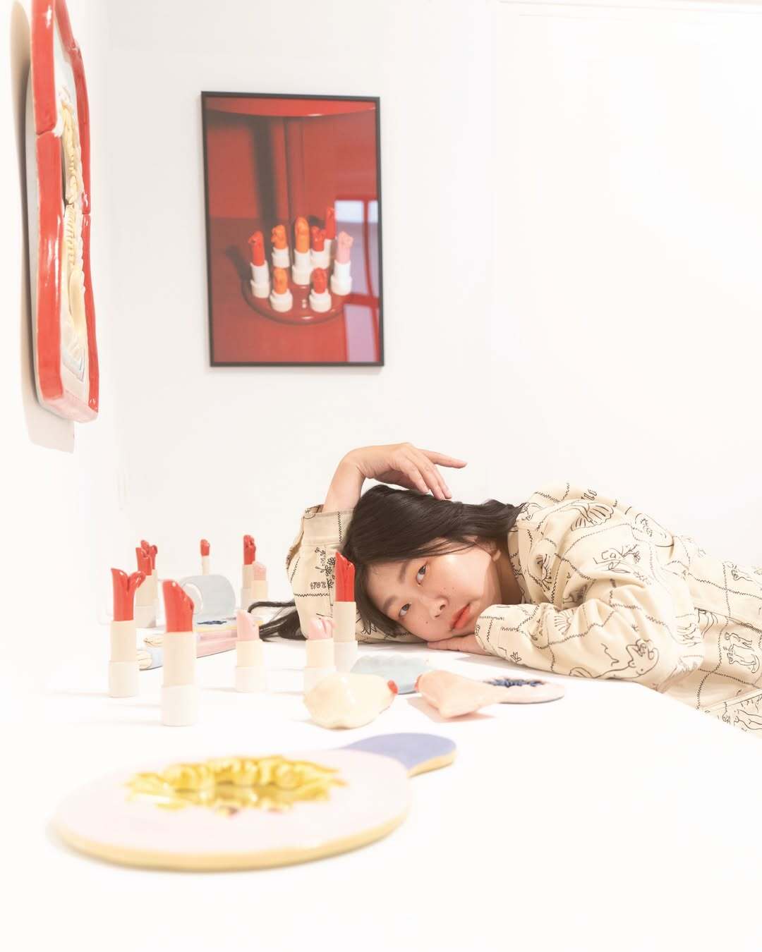 The pieces feel playful at first glance, then heavier the longer you stay with them. They echo the pressure of appearance, the intimacy of self maintenance, and the stories we hide behind soft colors and perfect glaze.