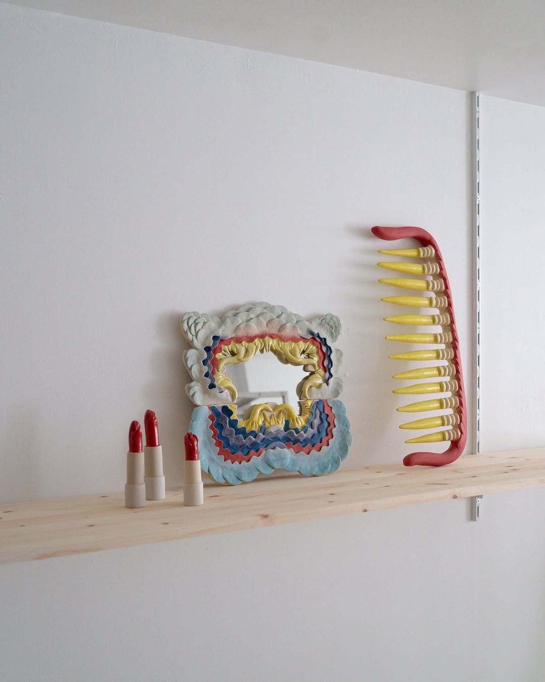 Lipsticks stretch into creatures, combs become tender threats, mirrors turn into portals that look back at you. Her sculptures sit between charm and discomfort, asking what we carry in our bodies and why we refuse to name it.