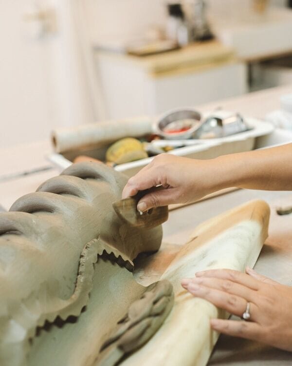 Eri Maeda shaping a new ceramic creature in her studio, working the clay by hand and carving its layered surface. Photo by @y_himama0918
