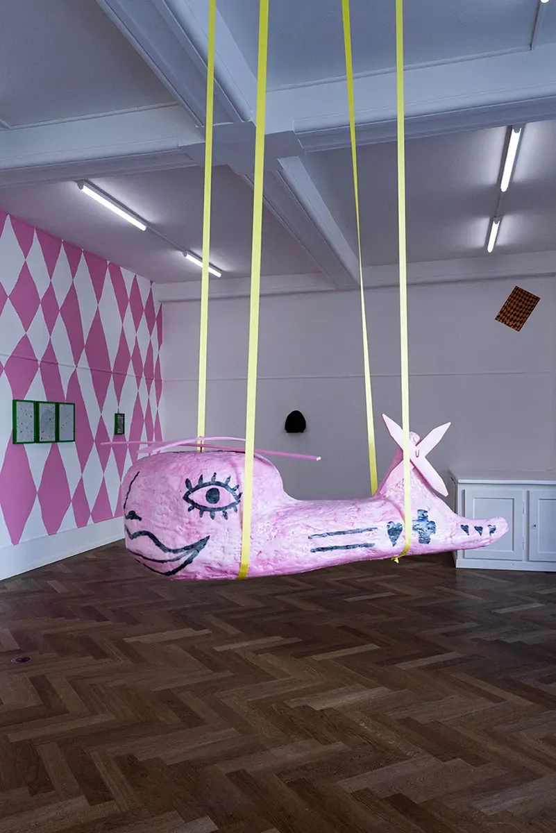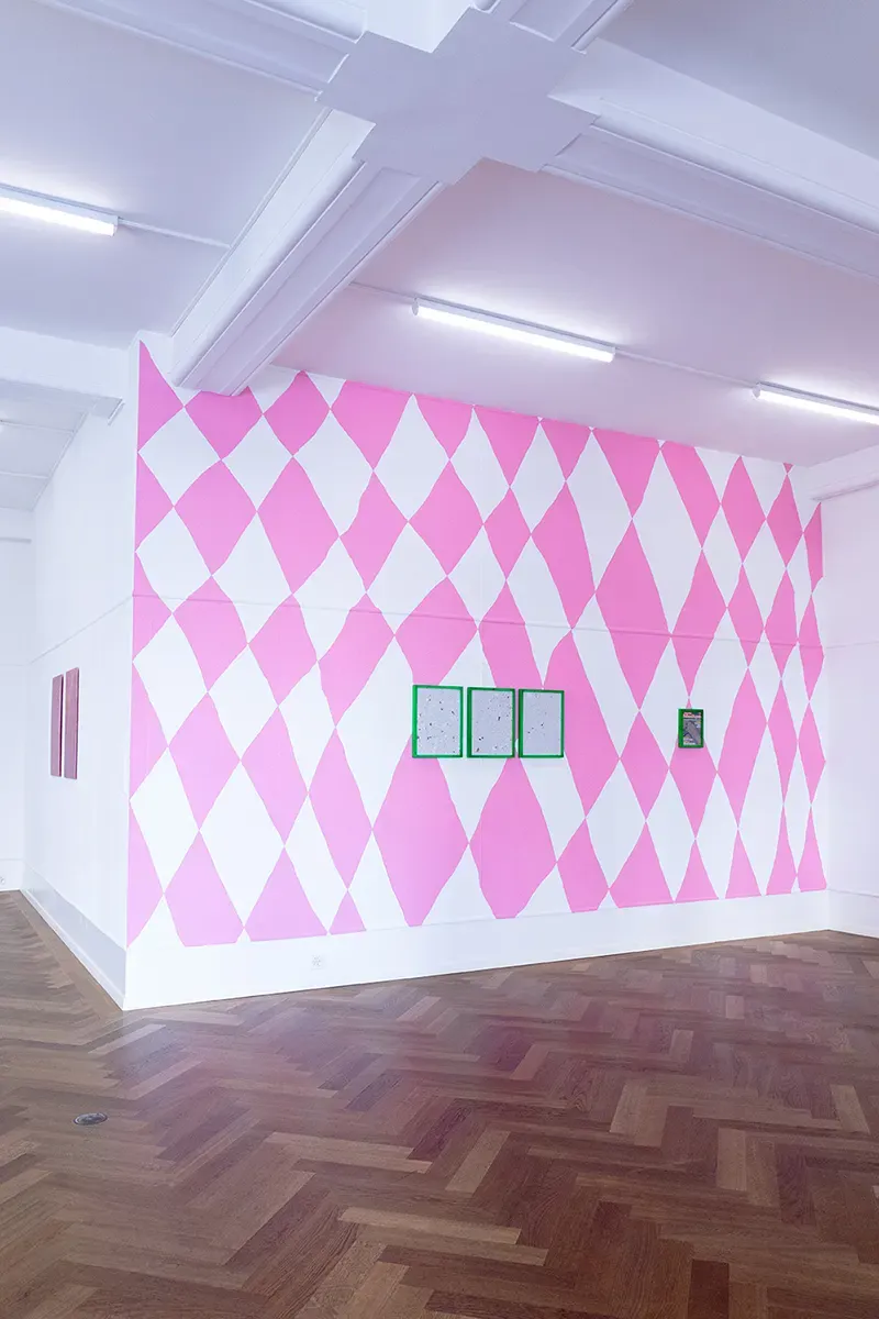 In this deconstruction, the artist creates space for something new. For a poem? A love letter? They hang as framed pictures over a candyfloss-coloured chequered pattern. This type of pattern is also ambiguous: while it appears petty bourgeois on tablecloths or picnic blankets, a scarf with chequered tassels can also be an expression of resistance and rebellion , Quote from the Saaltext von Katrin Spery, PINK HAWK DOWN
