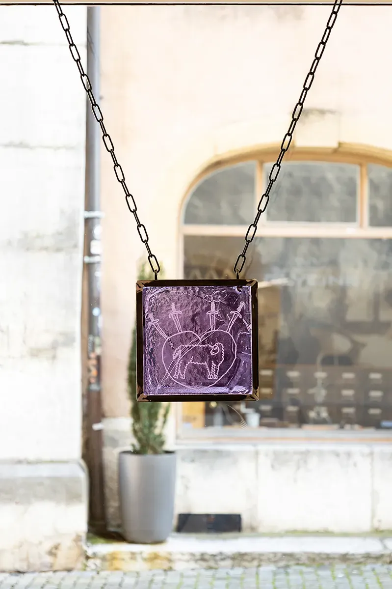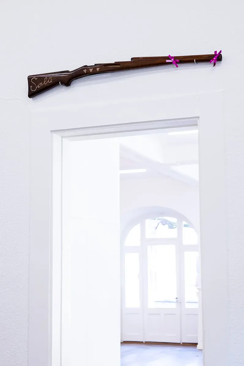 Felix Stöckle: l.) Verre Inocent, 2024, engraved glass, Krone/Couronne, Biel (CH) r.) Salü <3<3<3, 2024, engraving on wooden Gun, Krone/Couronne, Biel (CH) | Photo: Jerlyn Heinzen