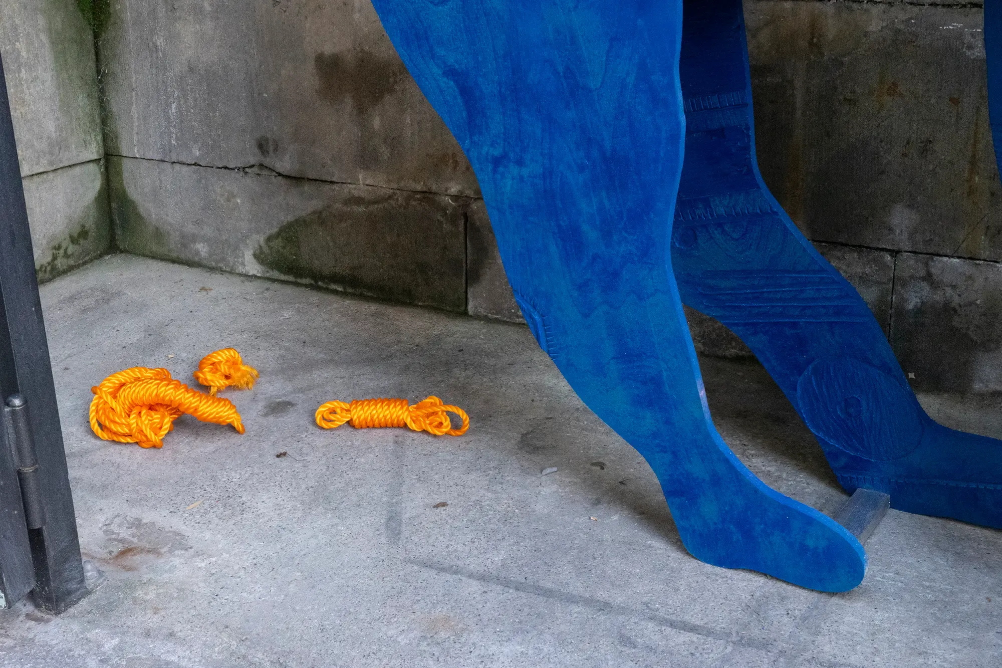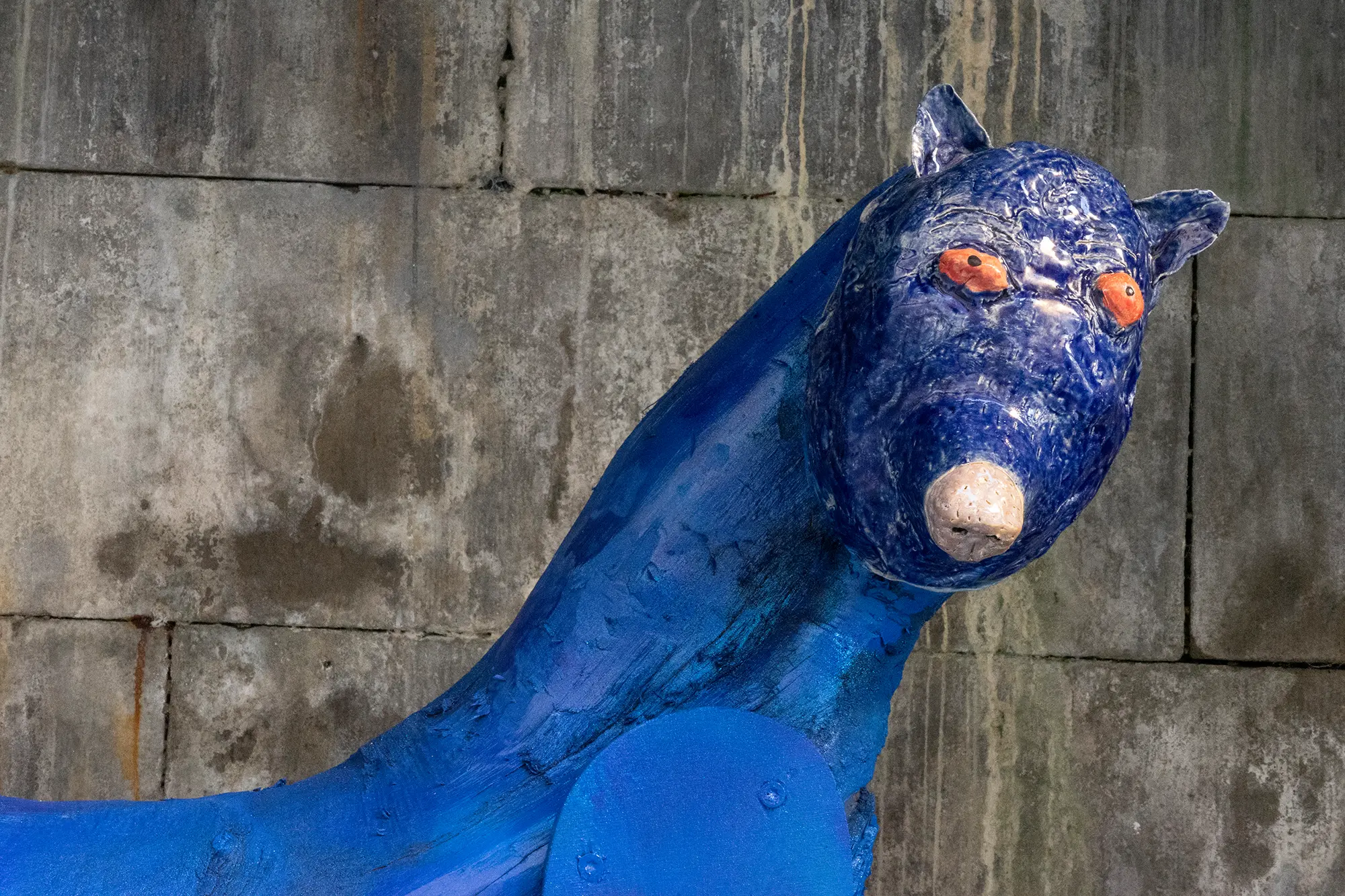 Felix Stöckle: Chien ou Ours, 2022, Carved lime wood and painted blue, ceramic and rope, 160cm x 130cm x 30cm, HILTIBOLD, St.Gallen (CH) | Photo: Marianne Rinderknecht