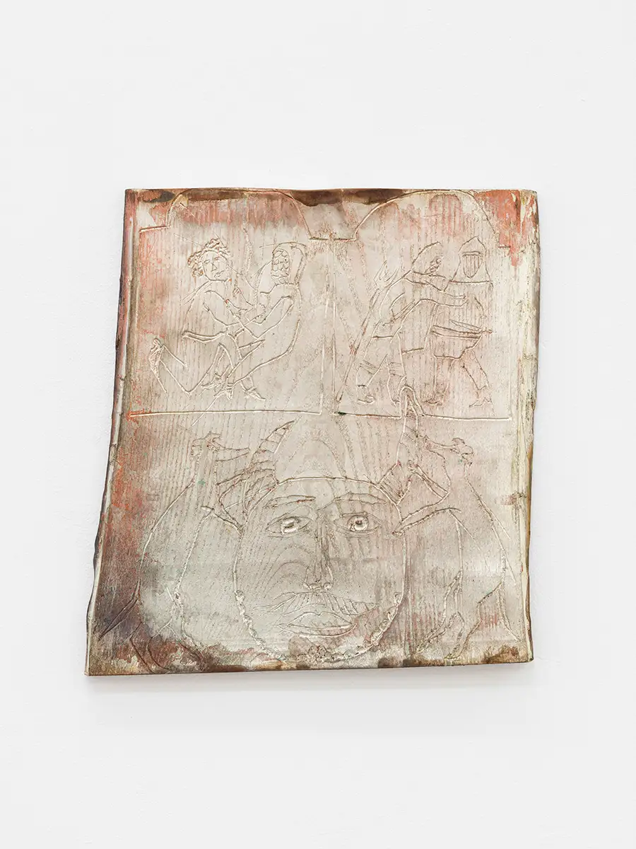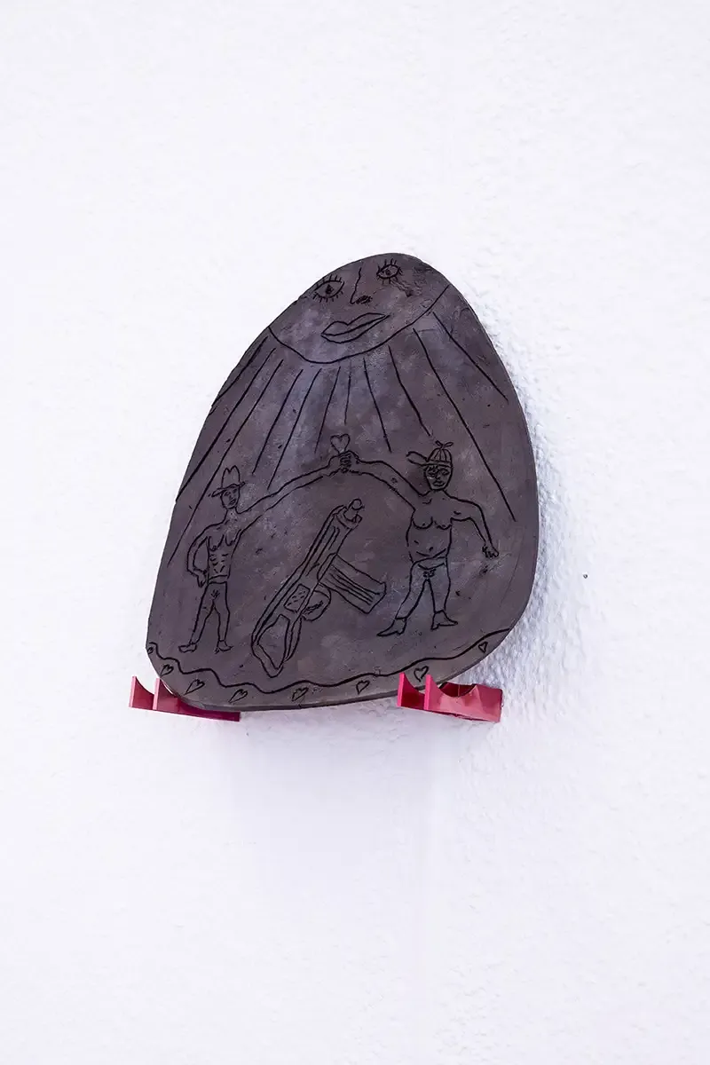 Felix Stöckle: left: GLOBI MAGAZIN 1943, 2024, Keramik geköllnert | Photo: Jerlyn Heinzen right -> Gladiatoren im Schlund, Kupfer- guss, 2023, AURA Kunstraum Düsseldorf & Enter Art Fair Kopenhagen. Photo Made by: Johannes Bend- zulla