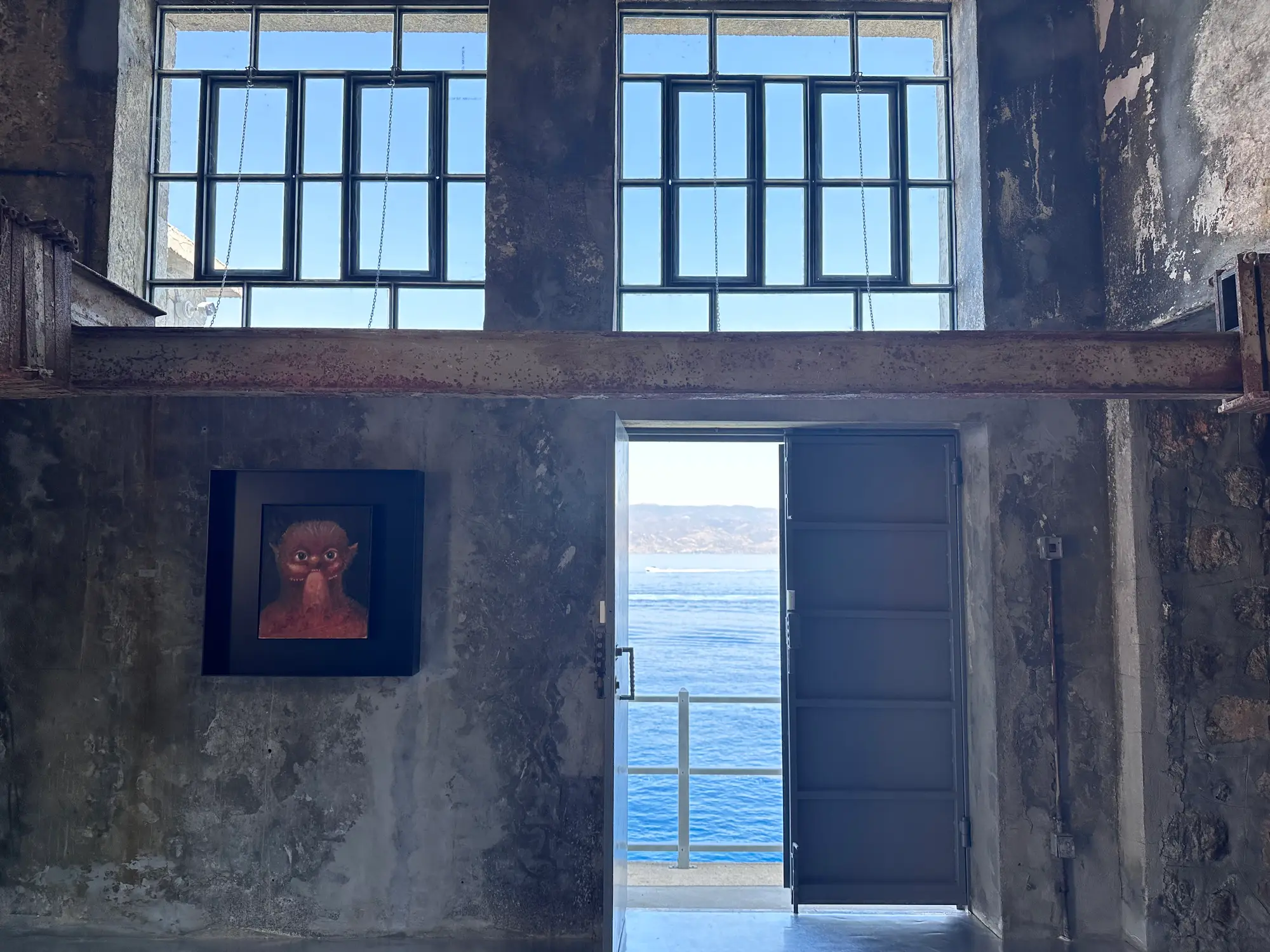 George Condo's intriguing painting, set against a rustic backdrop with a stunning sea view, on display at the DESTE Foundation Hydra.| Photo: Ernst Koslitsch